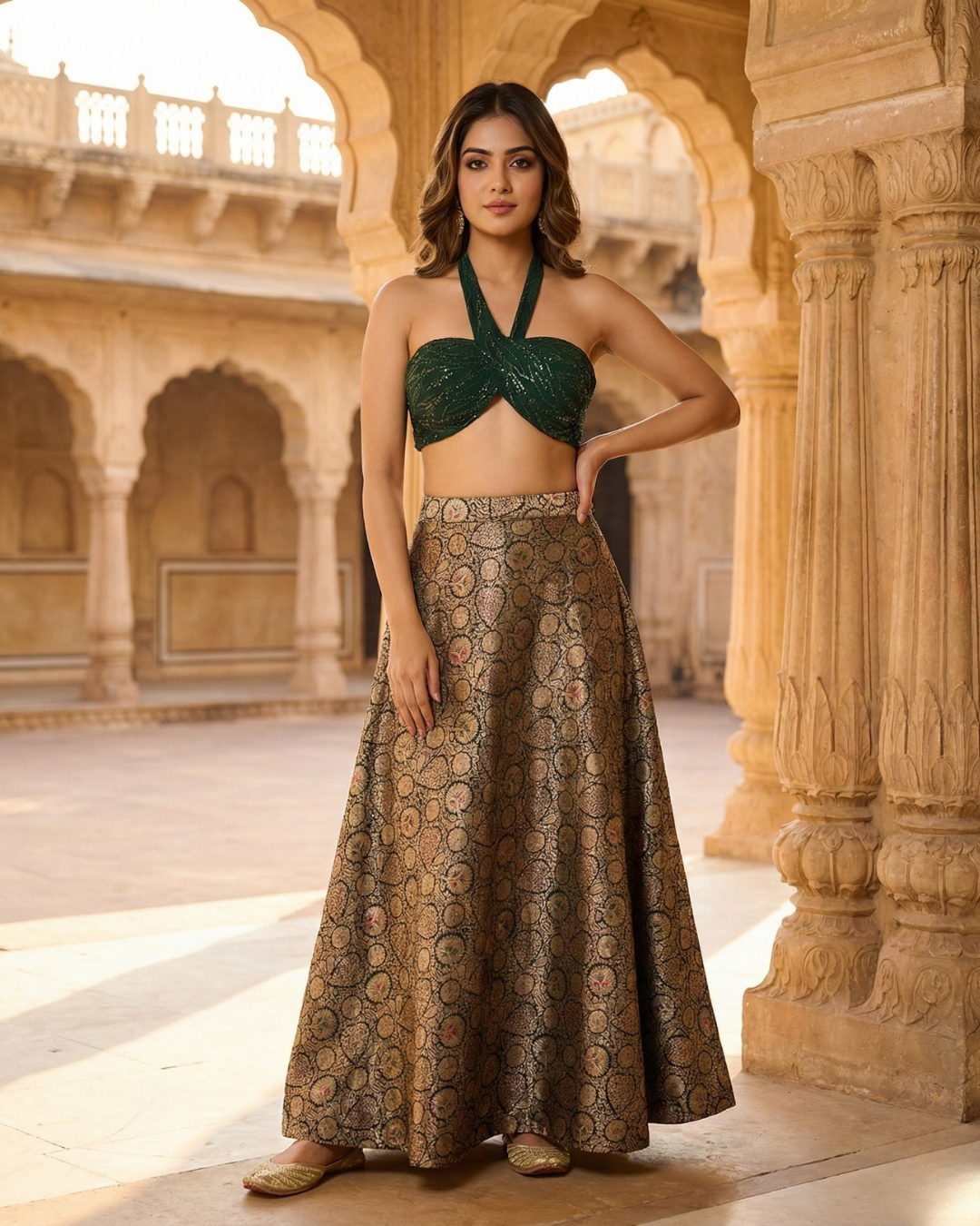 Bottle Green Halter Crop Top with Gold Brocade Lehenga Skirt