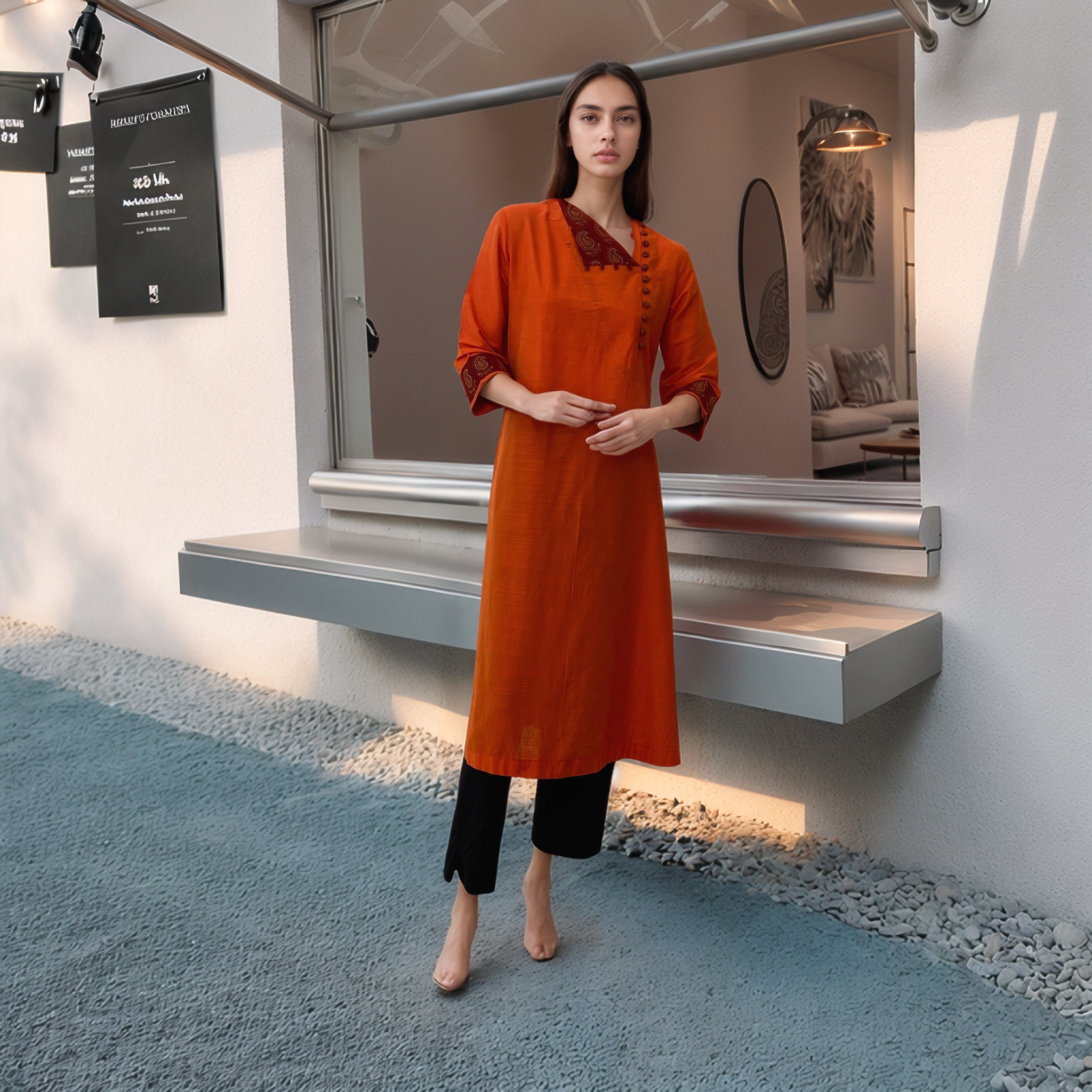 Elevate your summer wardrobe with our Orange OneSided Printed Collar Kurta! Made from soft and breathable Cotton Slub fabric, this A-Line style kurta features a vibrant solid print and unique details like an Asymmetric neckline and collar with a Round Collar Peak lapel. Perfect for casual occasions, experience comfort and style in one.