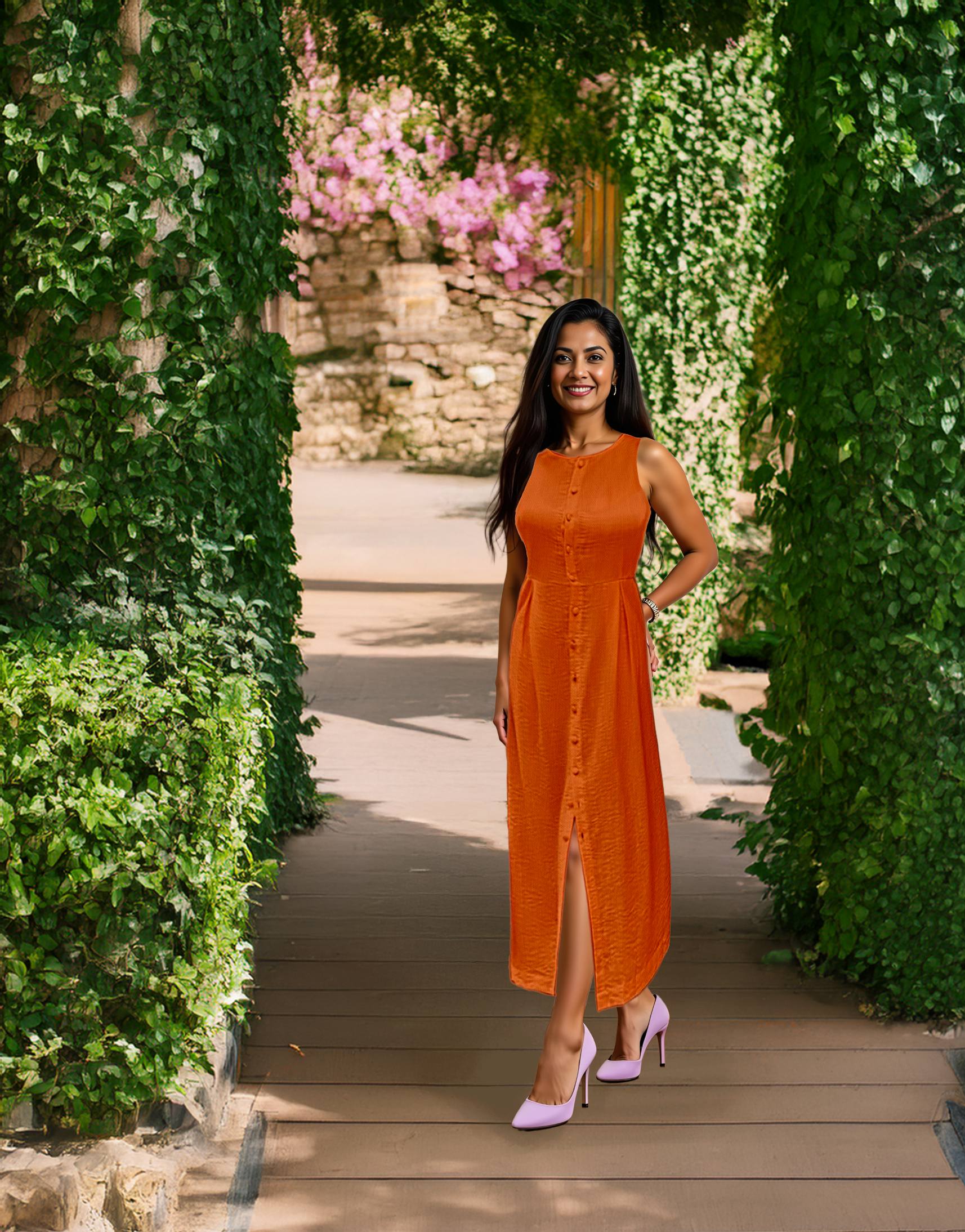Elevate your wardrobe with this sophisticated Orange Solid Color A-Line Dress. Crafted from premium cotton fabric, this sleeveless design features a flattering A-line silhouette with a classic round neckline. The below-the-knee length with front slits offers both elegance and ease of movement. Perfect for professional settings or upscale casual occasions where refined style is essential.