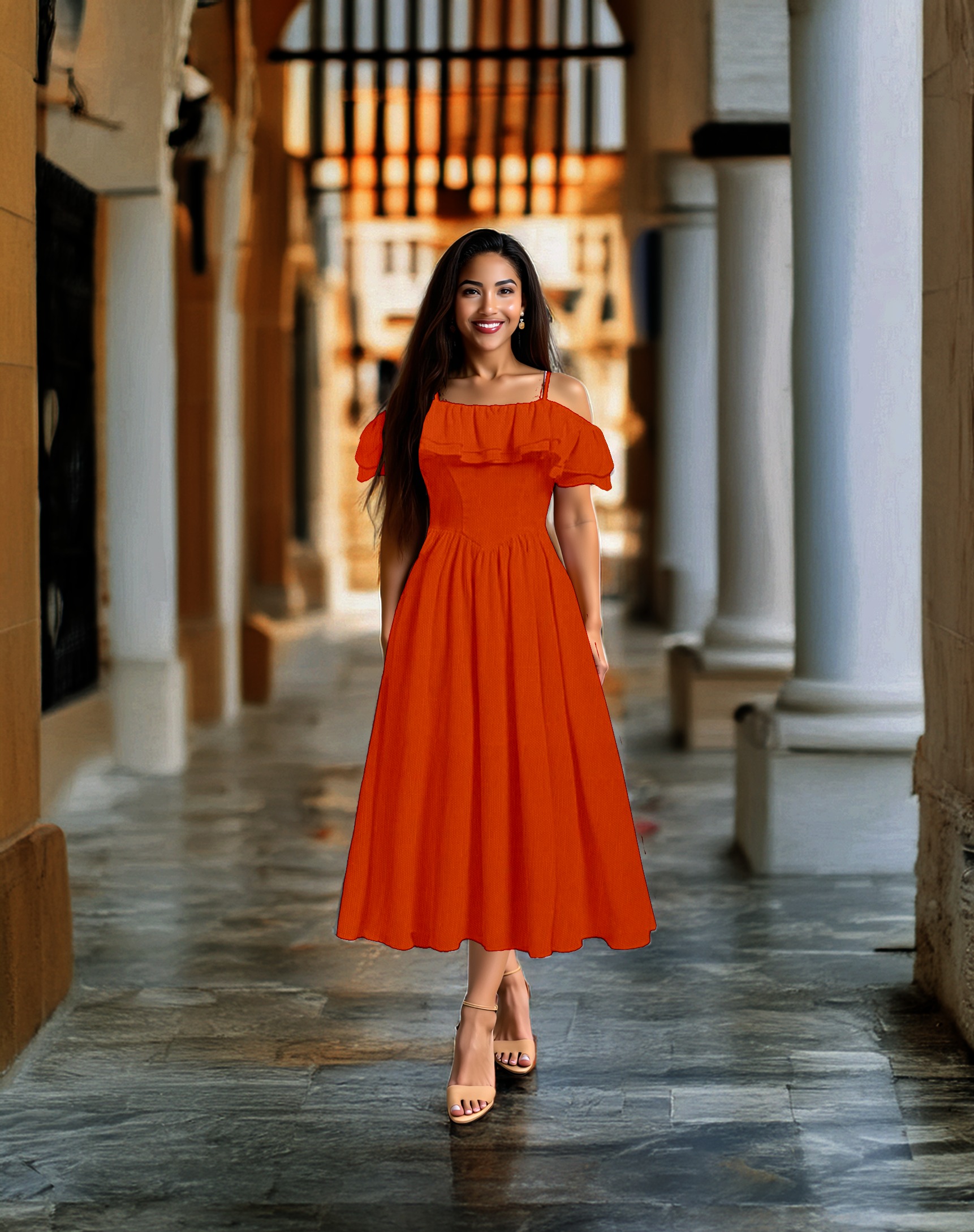 Elevate your wardrobe with this sophisticated Orange Solid Color Dress crafted from premium cotton fabric. Featuring an elegant square neckline with collar lapel detailing and fashionable cold-shoulder sleeves. The below-the-knee length with tasteful slits offers both style and ease of movement. This vibrant solid orange piece transitions effortlessly from professional settings to evening occasions.