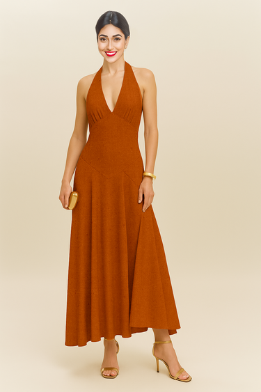 Elegantly crafted from premium cotton fabric, this Orange Solid Color Flared Dress features a flattering V-neck and sleeveless design that ensures comfort while maintaining sophistication. The below-the-knee length and flared silhouette create a graceful movement with every step, making it an ideal choice for both casual outings and semi-formal occasions. The vibrant orange hue adds a bold statement to your wardrobe.