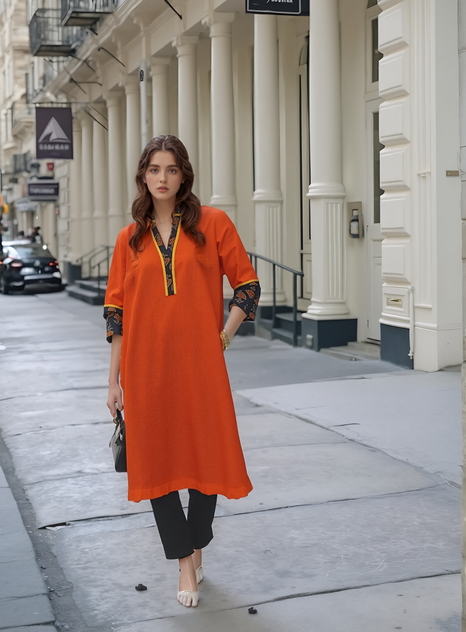 This orange kurta features a classic V-neckline paired with a mandarin collar, offering a refined and traditional look. Crafted from breathable cotton fabric, it ensures comfort throughout the day. The long sleeves and solid color design make it versatile for both casual and formal occasions. Its straight top length and side slits provide ease of movement while maintaining a polished silhouette. Ideal for those seeking a blend of style and comfort in ethnic wear.