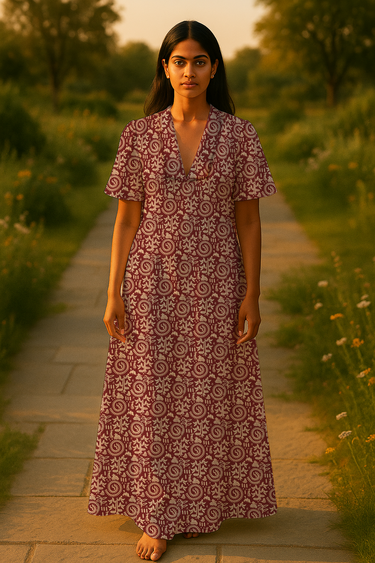 Embrace authentic self-expression with our Rust Warli Print A-Line Cotton Dress. This thoughtfully handcrafted piece features a flattering V-neck, elegant Chelsea collar, and graceful bell sleeves, falling below the knee for timeless sophistication. Its unique print connects you to rich Eastern artistry, offering a reassuring blend of comfort and conscious style. Choose this mindfully crafted garment for sustainable elegance. Artfully Yours, Consciously Crafted.