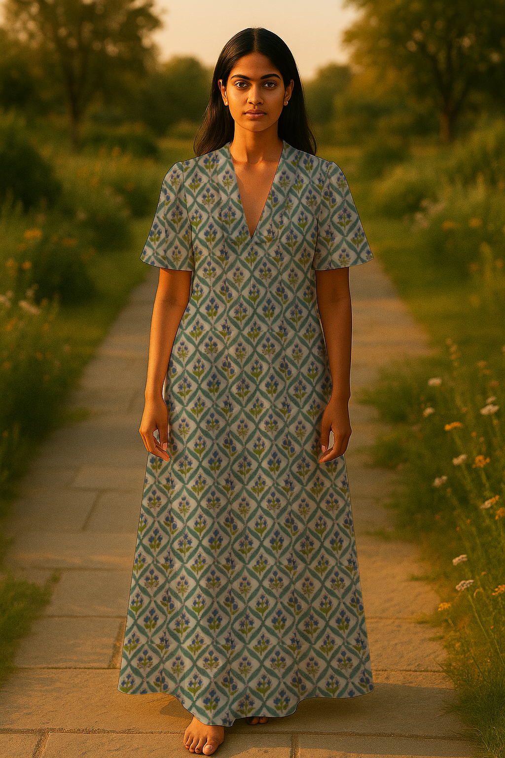 Embrace timeless elegance with our Off-White Sanganeri, Blue Floral Geometric Jaal Print cotton A-Line dress. Thoughtfully designed with a V-neck, Chelsea collar, and graceful bell sleeves, this below-the-knee piece offers comforting style. Mindfully crafted, it's a reassuring choice for authentic self-expression, blending Eastern artistry with modern sensibility. Artfully Yours, Consciously Crafted.