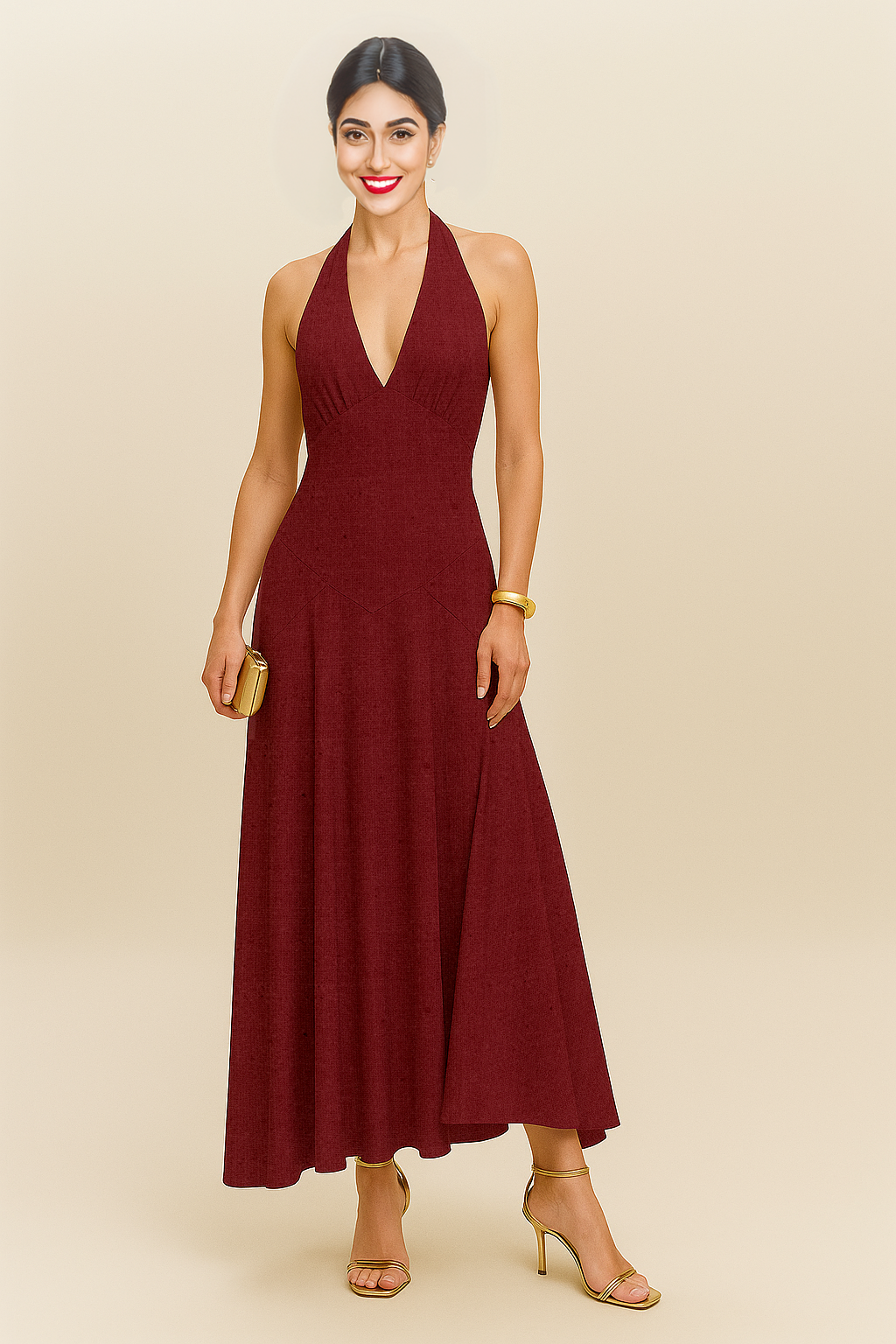 Elevate your wardrobe with this sophisticated Rust Maroon Solid Color Flared Dress. Crafted from premium cotton fabric, this below-the-knee dress features an elegant V-neck with collar lapel detailing and a flattering flared silhouette. The sleeveless design offers versatility for layering, while strategic slits ensure ease of movement. Perfect for both professional settings and social gatherings where refined style is essential.
