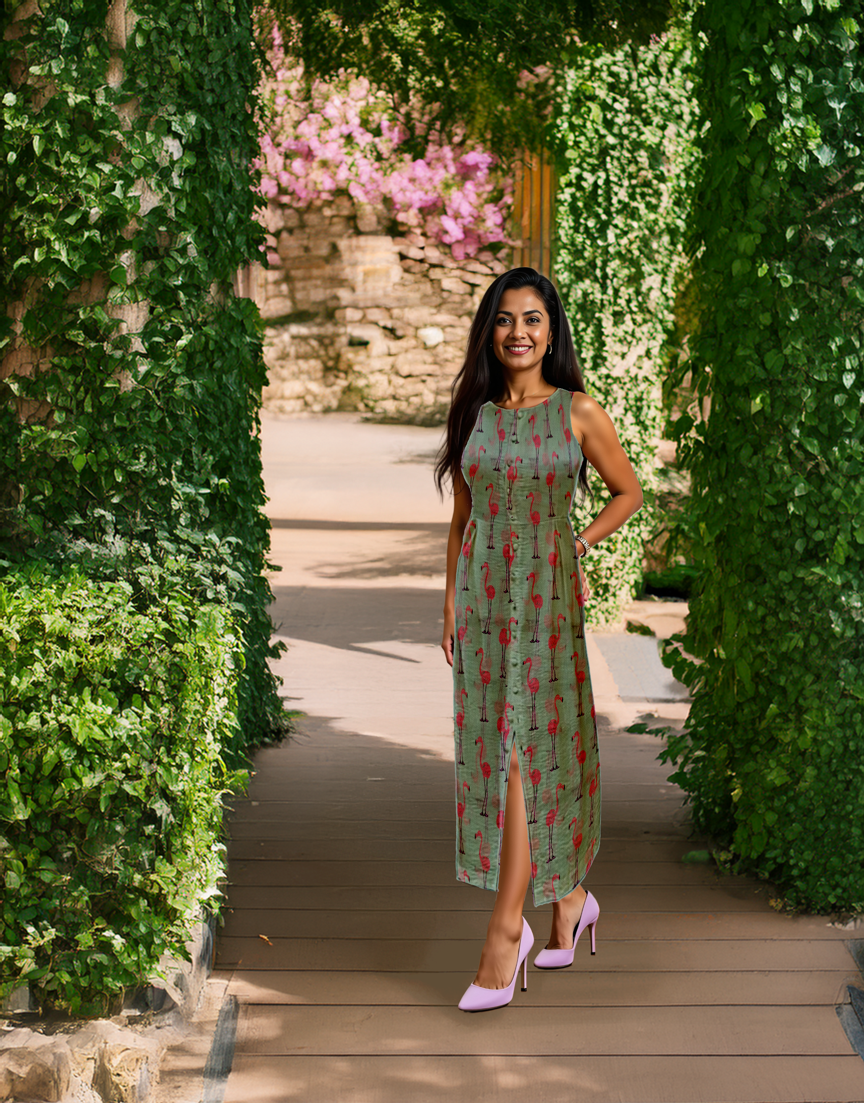 Elevate your wardrobe with this sophisticated Sea Green Flamingo Print A-Line Dress. Crafted from premium Polyester Georgette fabric, this sleeveless dress features a flattering round neckline and below-the-knee length with stylish front slits. The distinctive flamingo print against a sea green backdrop creates a refined yet eye-catching silhouette, perfect for both casual gatherings and semi-formal occasions.
