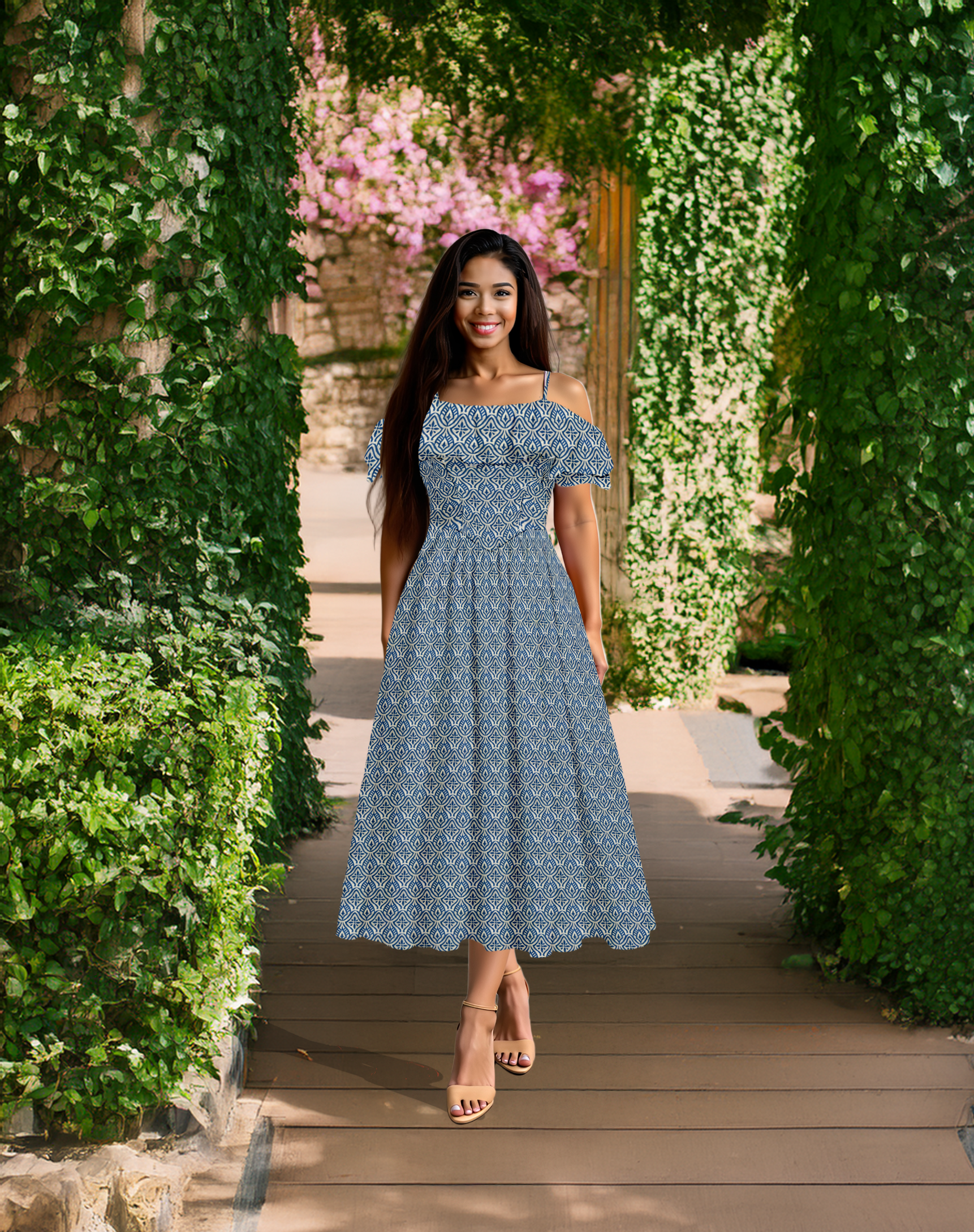 Elevate your wardrobe with this sophisticated White Sanganeri A-Line Dress featuring elegant blue geometric prints. Crafted from premium Cotton Cambric fabric, this below-the-knee dress showcases a flattering A-line silhouette and stylish off-shoulder neckline. The traditional Sanganeri printing technique adds authentic artisanal value to this versatile piece, perfect for both casual outings and semi-formal occasions.