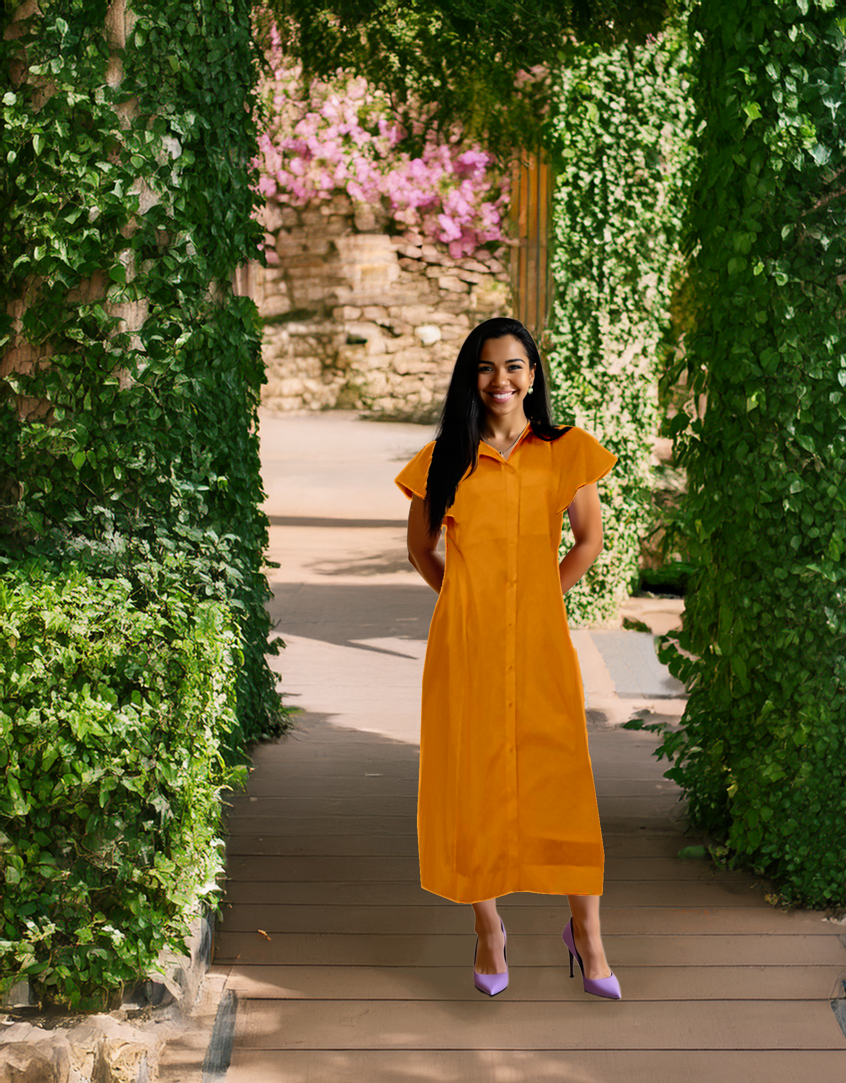 Elevate your wardrobe with this sophisticated Yellow Solid Color Shirt Dress. Featuring a classic shirt collar with V-neck styling, complemented by elegant cap sleeves. The below-the-knee length with thoughtfully placed slits ensures both comfort and mobility. Crafted from premium cotton fabric, this solid yellow dress combines breathability with refined style, perfect for professional settings or upscale casual occasions.