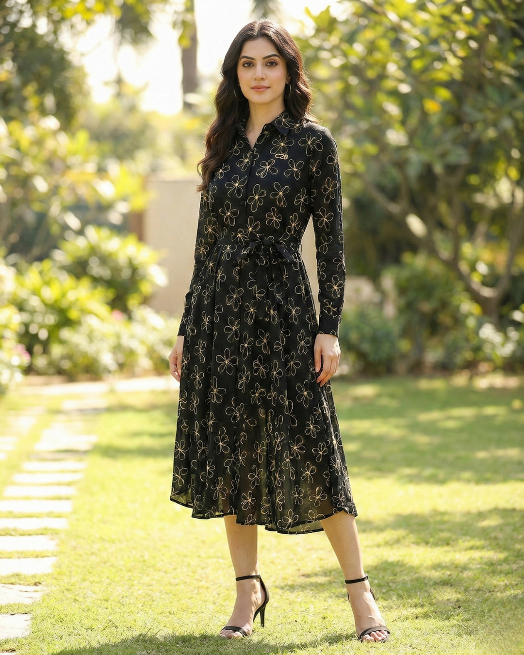 Redefine versatility with this effortlessly chic black shirt dress, designed to take you from boardroom meetings to evening soirées with ease. This piece embodies modern femininity, featuring a striking contrast between the deep noir base and the delicate, gold-toned floral outline print that cascades across the fabric. It is the perfect choice for the woman who values a polished look that doesn't compromise on comfort or style.