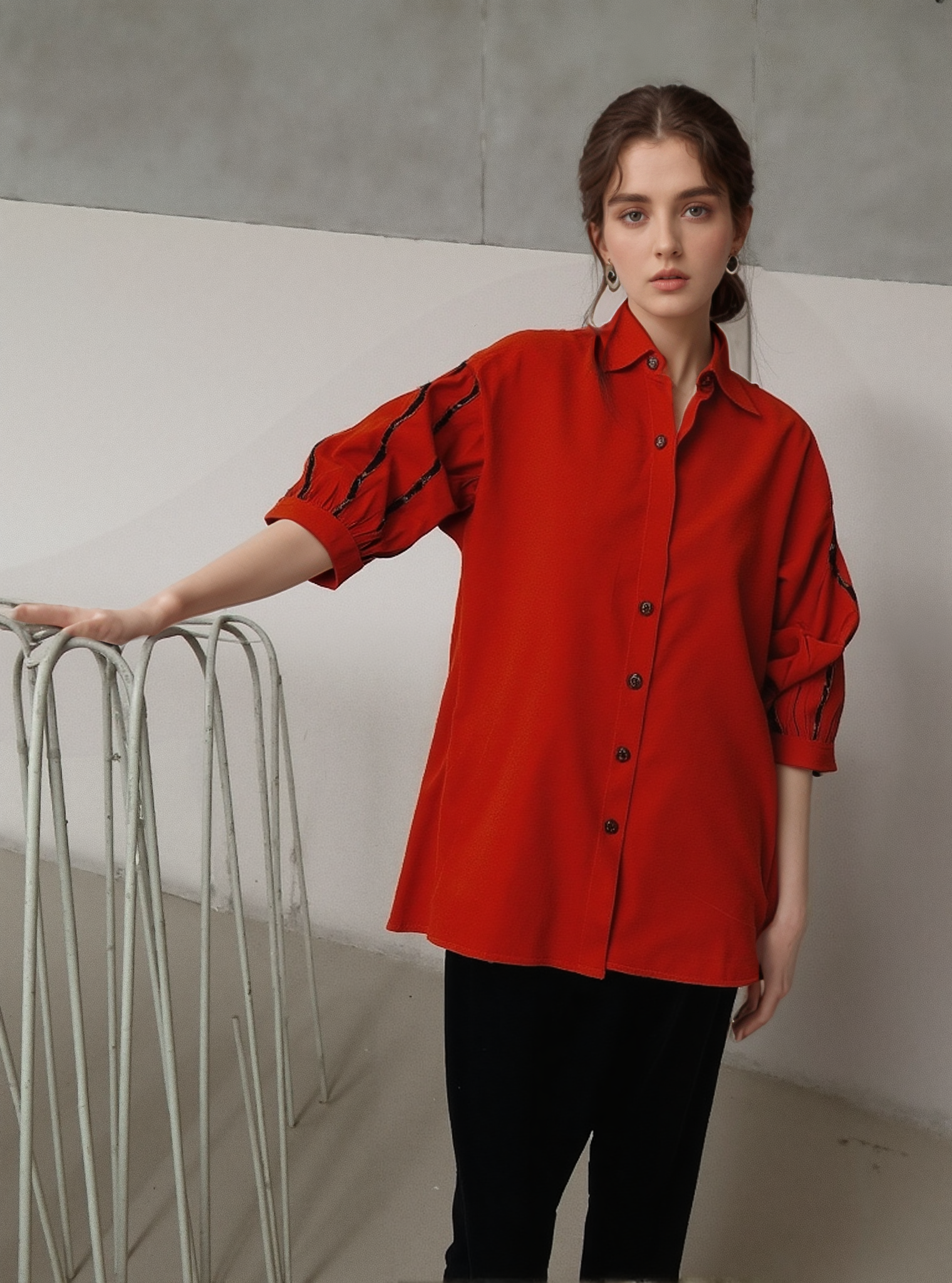 This orange solid color shirt features a Western-style V-neckline paired with a regular collar, offering a refined yet contemporary look. Crafted from breathable cotton fabric, it ensures comfort and durability throughout the day. The medium-length sleeves and clean silhouette make it a versatile choice for both casual and semi-formal occasions. Its simple design allows easy pairing with various bottoms, making it a practical addition to any wardrobe.