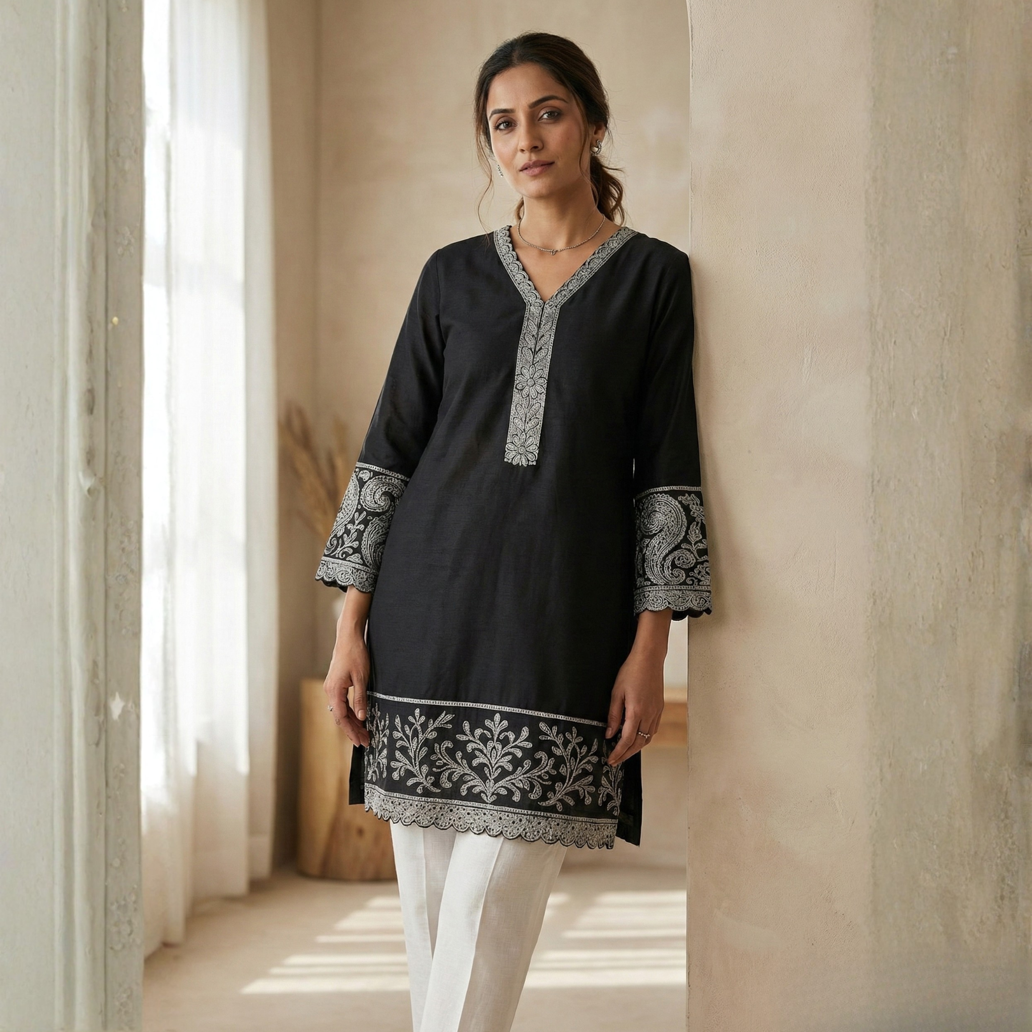 Elevate your ethnic wardrobe with this striking black and white kurta set, designed for the modern Indian woman. The sophisticated V-neckline features intricate silver embroidery that catches light beautifully, adding refined elegance to your ensemble. Crafted with premium fabrics, this versatile piece transitions seamlessly from festive occasions to elevated everyday wear. The coordinated set ensures a polished, put-together look without the styling effort. Perfect for celebrations, family gatherings, or when you want to make a confident statement in traditional fashion.
