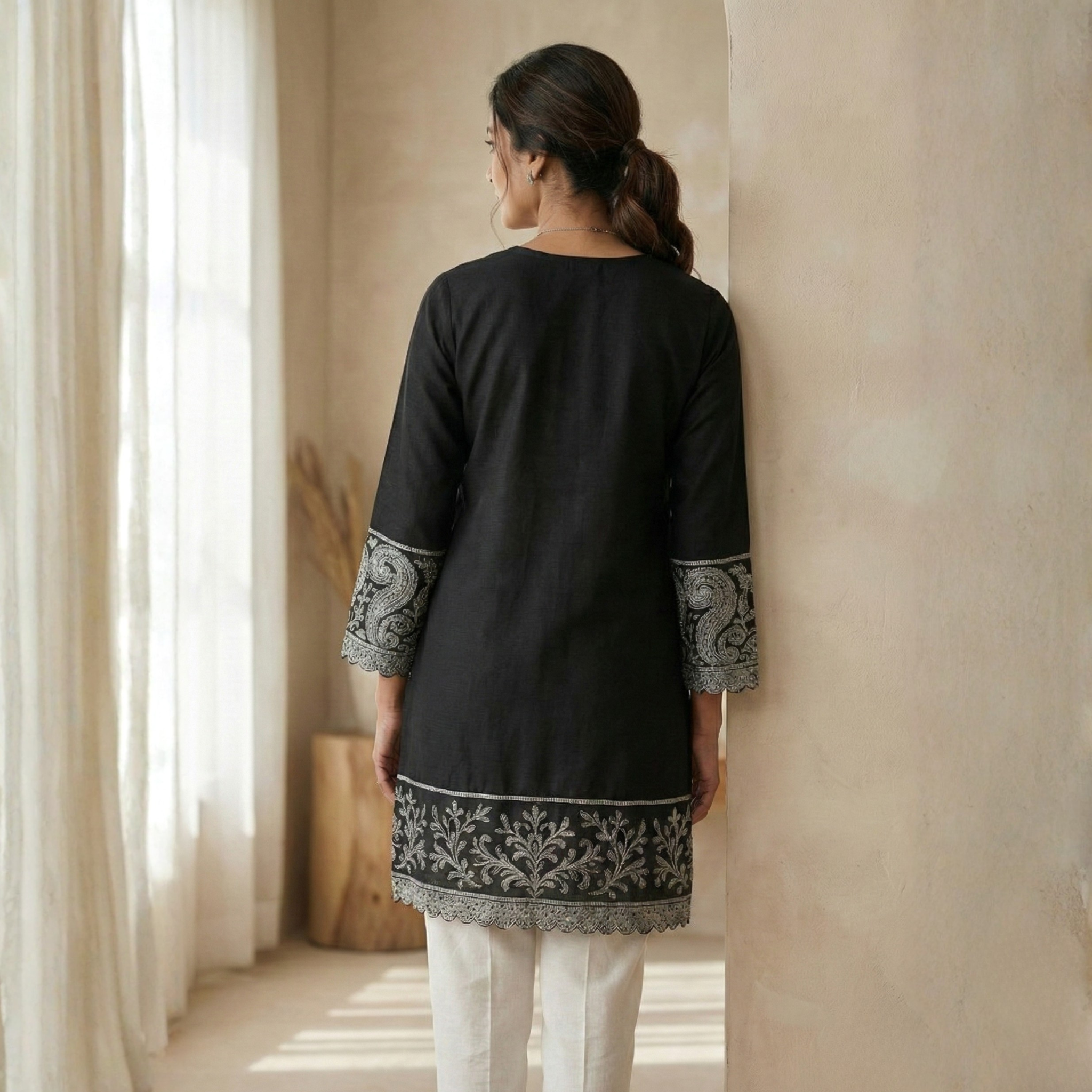 Black & White Kurta Set with Silver Embroidered V-Neck