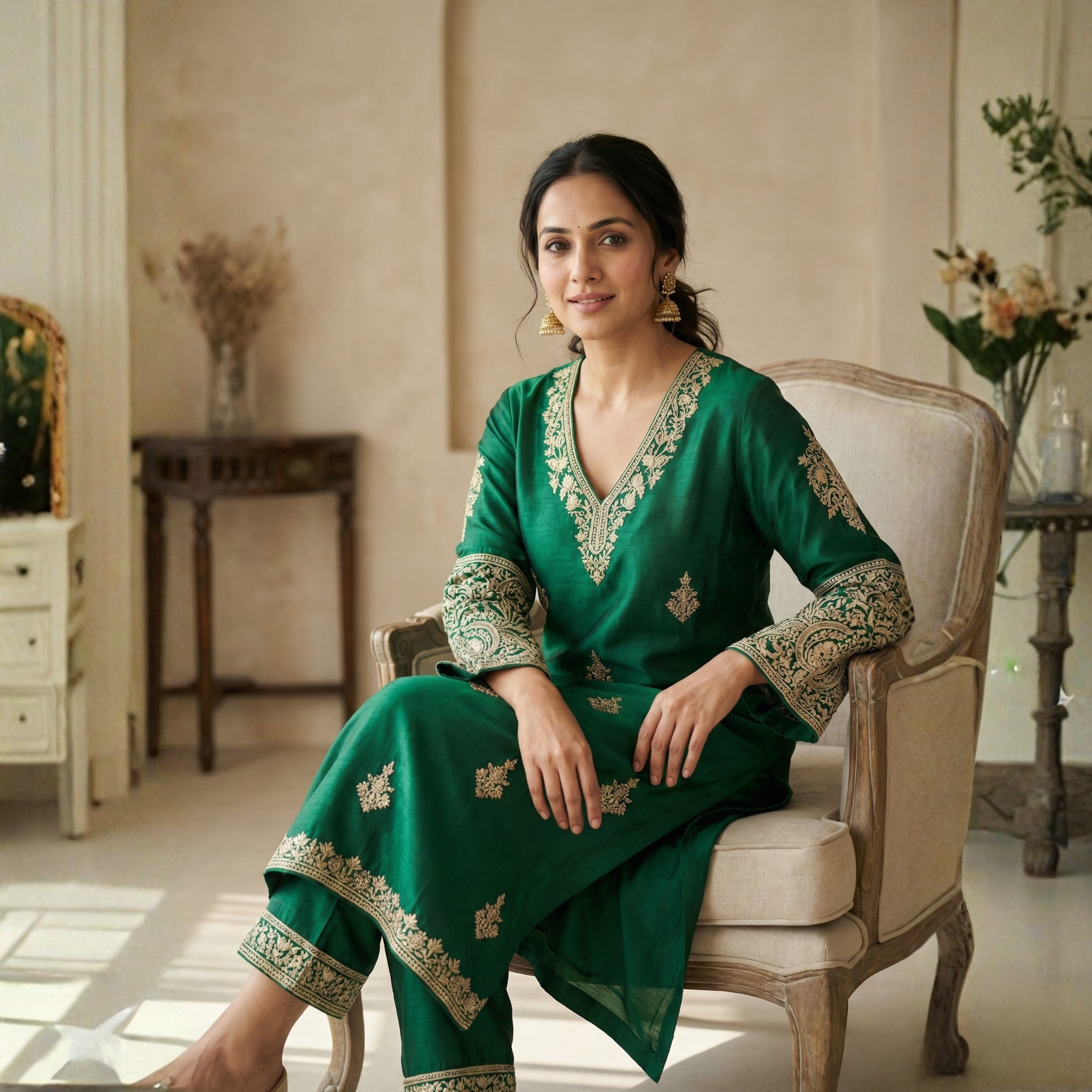 This emerald green silk kurta set combines luxurious fabric with refined embellishment for occasions demanding understated elegance. Crafted from pure silk, the kurta drapes with natural grace while gold embroidery detailing frames the neckline and borders, reflecting traditional artisanal techniques. The accompanying dupatta completes the ensemble, offering versatility in styling. The deep emerald tone provides a sophisticated canvas that works across seasons and skin tones, while the quality silk construction ensures durability and comfort. A curated piece for discerning wardrobes seeking timeless ethnic wear with contemporary appeal.