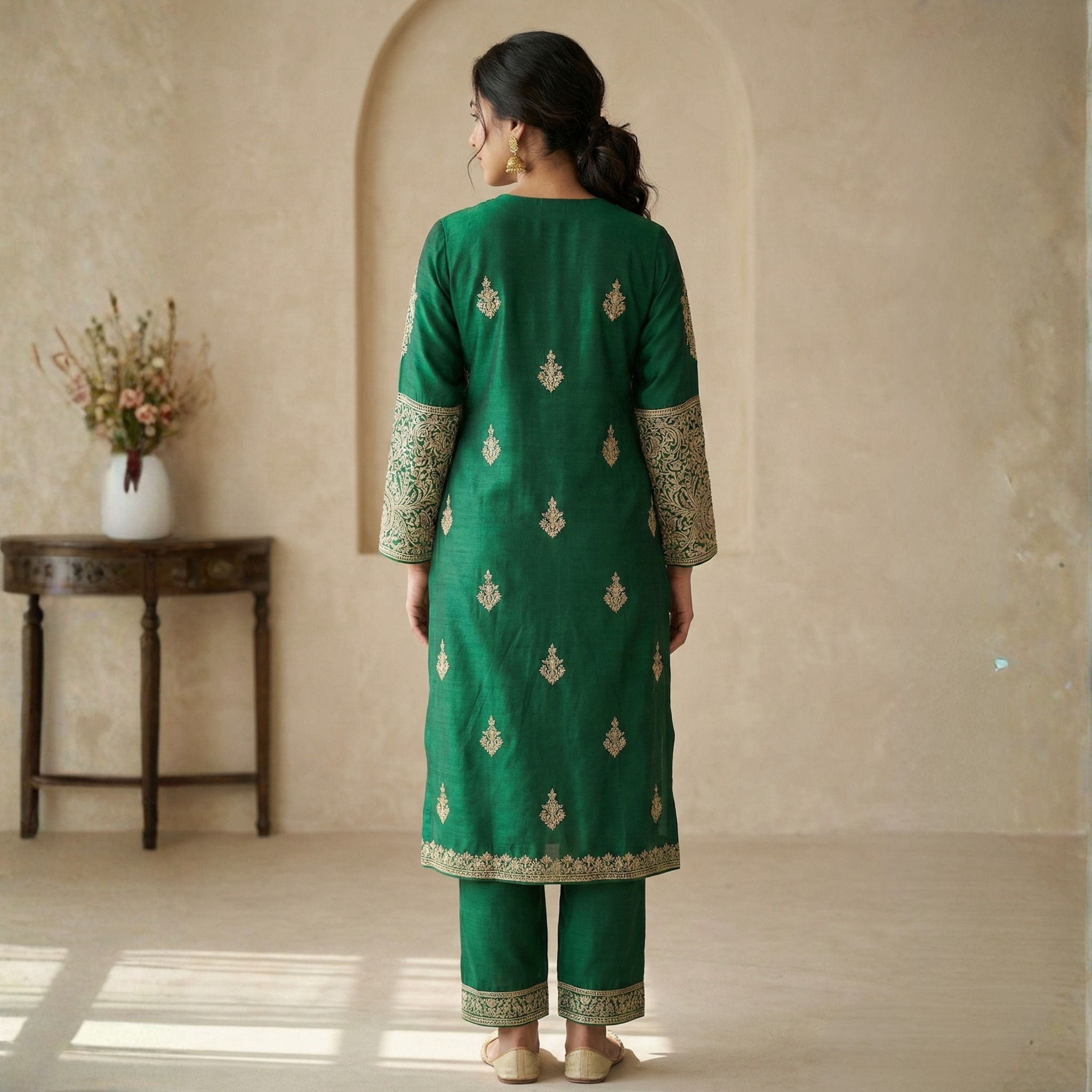 Emerald Green Silk Kurta Set with Gold Embroidery