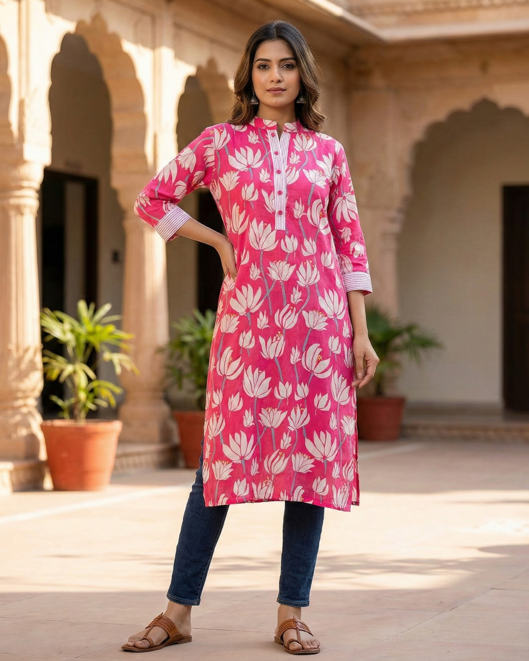 Fuchsia Pink Cotton Kurta with Large Floral Print & Striped Accents