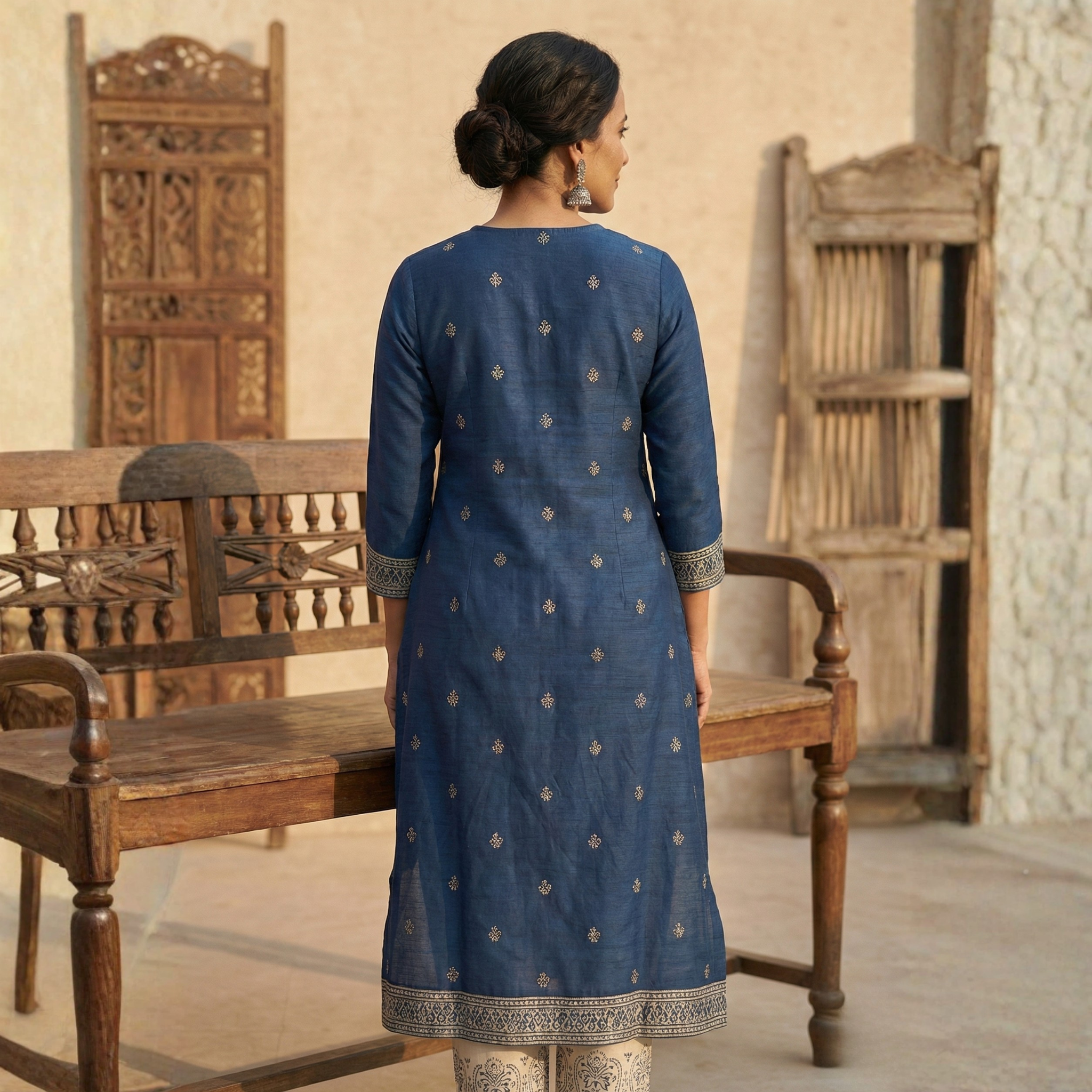 Elevate your ethnic wardrobe with this sophisticated indigo kurta set, designed for the modern Indian woman. The straight-cut kurta features intricate silver embroidery that catches light beautifully, paired with cropped pants in a complementary geometric pattern. The combination of rich indigo and metallic detailing creates a refined, versatile look suitable for festive occasions, family gatherings, or elevated everyday wear. Premium fabric construction ensures comfort and durability, while the tailored silhouette flatters multiple body types. Perfect for those seeking traditional aesthetics with contemporary styling sensibility.