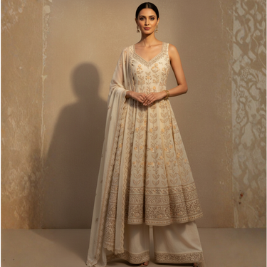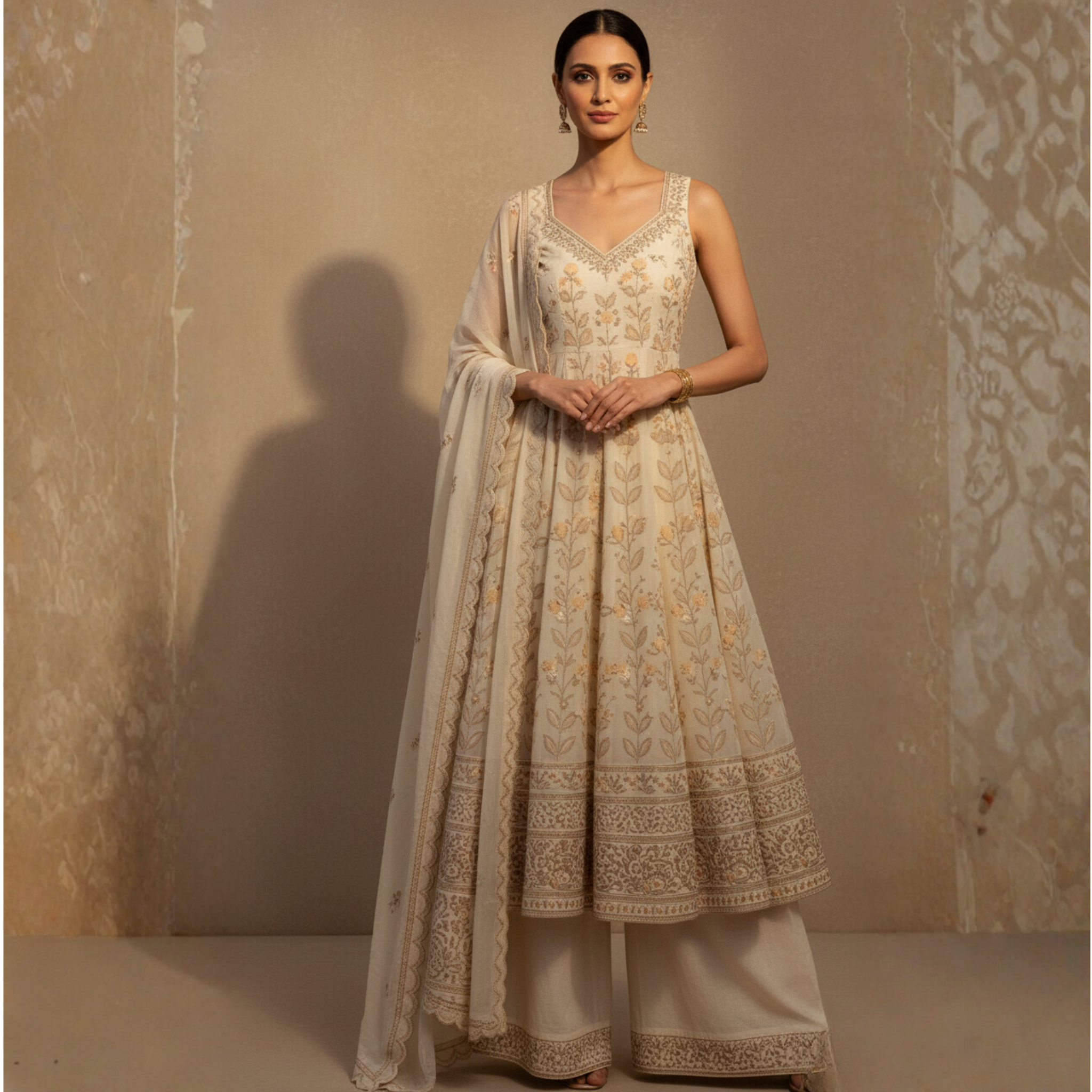Elevate your ethnic wardrobe with this exquisite ivory Chikankari-style Anarkali set, a timeless piece that seamlessly blends traditional craftsmanship with contemporary silhouettes. The intricately embroidered Anarkali kurta features delicate Chikankari detailing that catches light beautifully, while the cropped pants offer a modern, flattering fit. Perfect for festive occasions, celebrations, or elevated everyday wear, this ensemble delivers sophisticated elegance with authentic Indian design sensibilities. The ivory palette ensures versatility, pairing effortlessly with statement jewelry and traditional accessories for a polished, premium look.