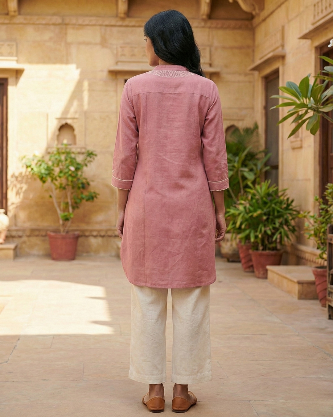 Cut from a breathable, textured cotton blend, this tunic features a smart mandarin collar that leads into a full button-down placket. The silhouette is defined by a relaxed straight fit and a contemporary curved shirt-tail hemline. Subtle yet striking white geometric embroidery adorns the shoulders and cuffs, while a functional side pocket—edged with matching embroidery—adds a practical, thoughtful touch to the design.