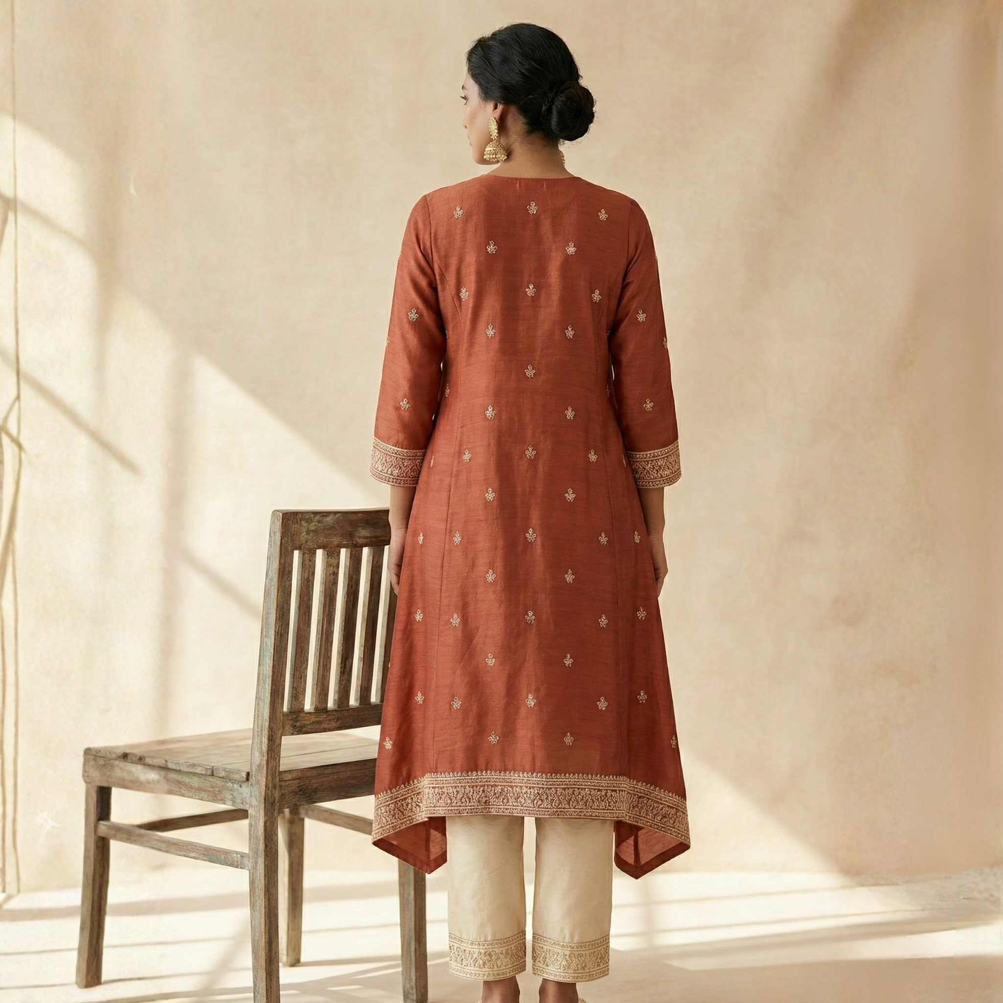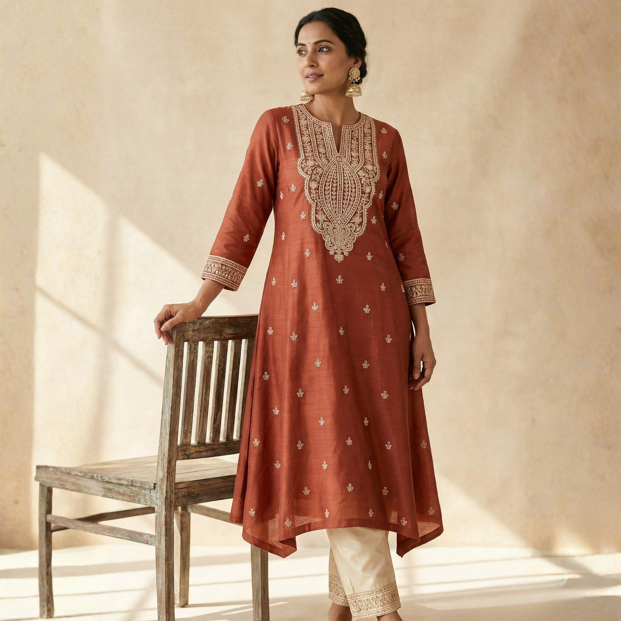 Rust Kurta with Heavy Yoke Embroidery and Ivory Cropped Pants