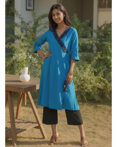 Embrace serene elegance with our Turquoise Blue Cotton Kurta. Its thoughtfully designed overlap V-neck and comfortable regular sleeves create a flattering silhouette. Falling gracefully below the knee with front slits, this piece offers effortless movement and style. Mindfully handcrafted, it provides comforting confidence and authentic self-expression, reassuring your commitment to sustainable beauty. Artfully Yours, Consciously Crafted.