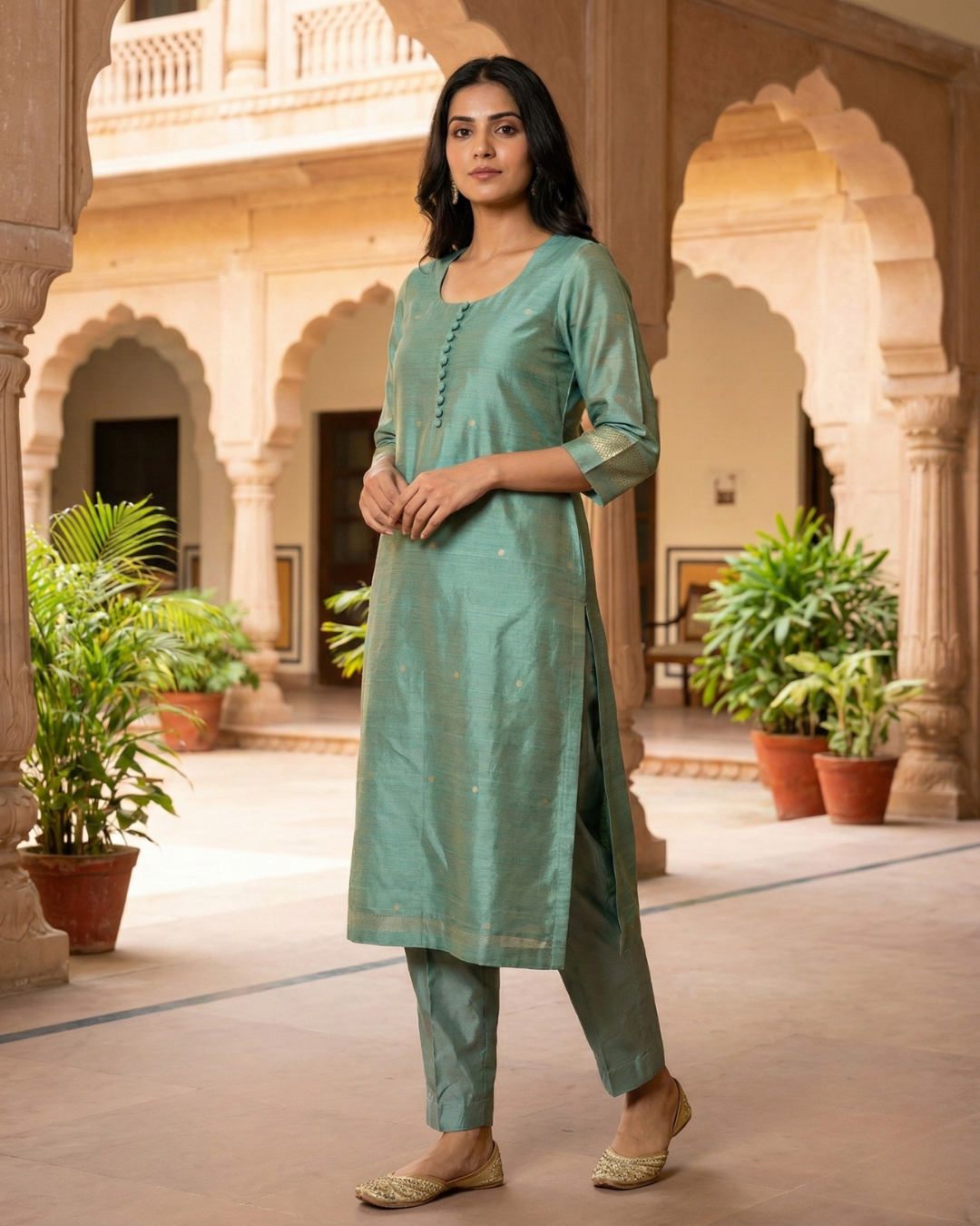 Step into a world of ethereal elegance with this soothing seafoam green ensemble. Perfect for the woman who prefers her luxury to speak in whispers rather than shouts, this set radiates a calm, poised sophistication. The lustrous fabric captures the light beautifully, making it an impeccable choice for daytime festivities, office celebrations, or intimate family gatherings where grace is the dress code.
