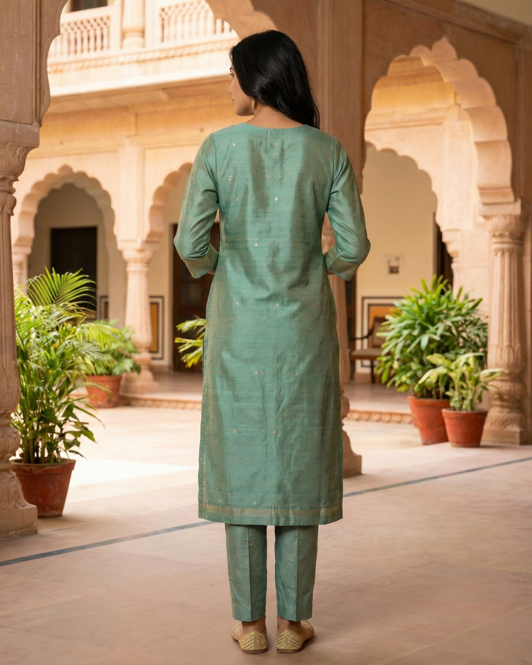 Teal Green Chanderi Silk Suit with Gold Zari Borders