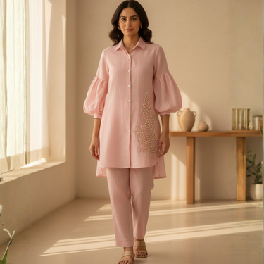 Powder Pink Embroidered Puff Sleeve Co-ord Set
