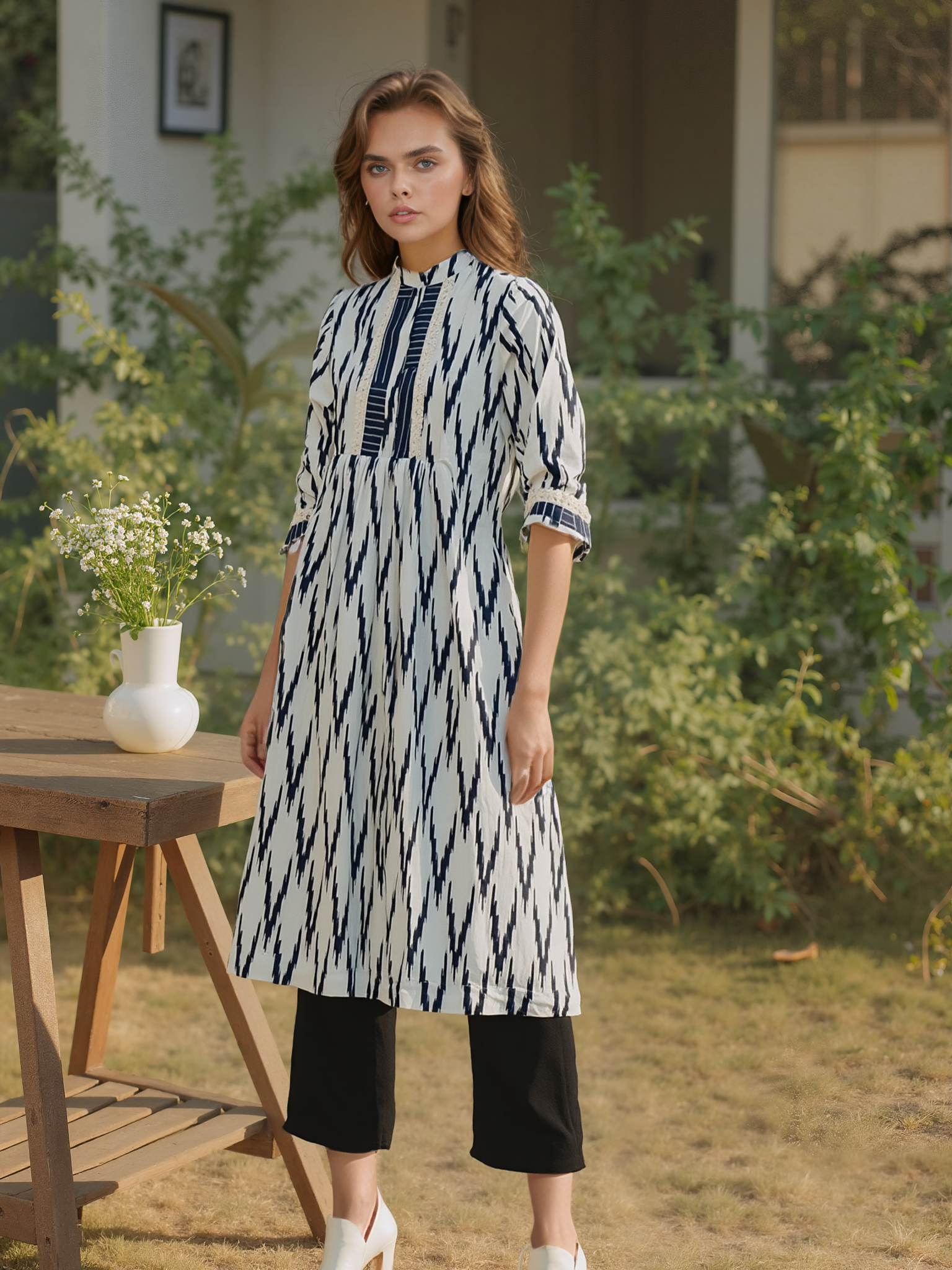 White, Navy Blue Ikkat Print Kurta Neckline Mandarin Collar Shirt