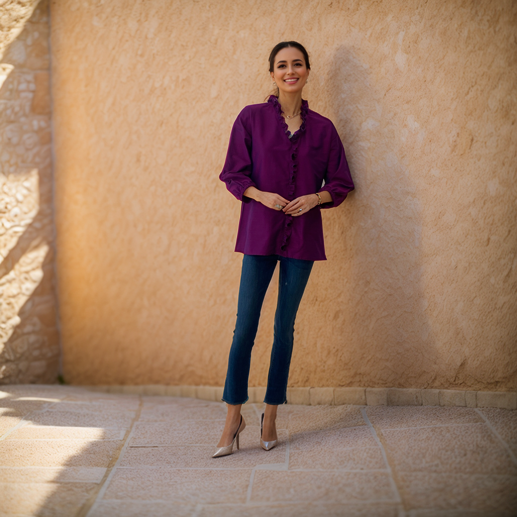 Introducing our stunning Purple Peasant Sleeves V-neck with Frills Details Cotton Tunics! This tunic not only features a gorgeous deep purple hue, but also has flattering peasant sleeves and delicate frill details. Made with soft and breathable cotton, this tunic is perfect for any occasion and will keep you feeling comfortable and stylish all day long!