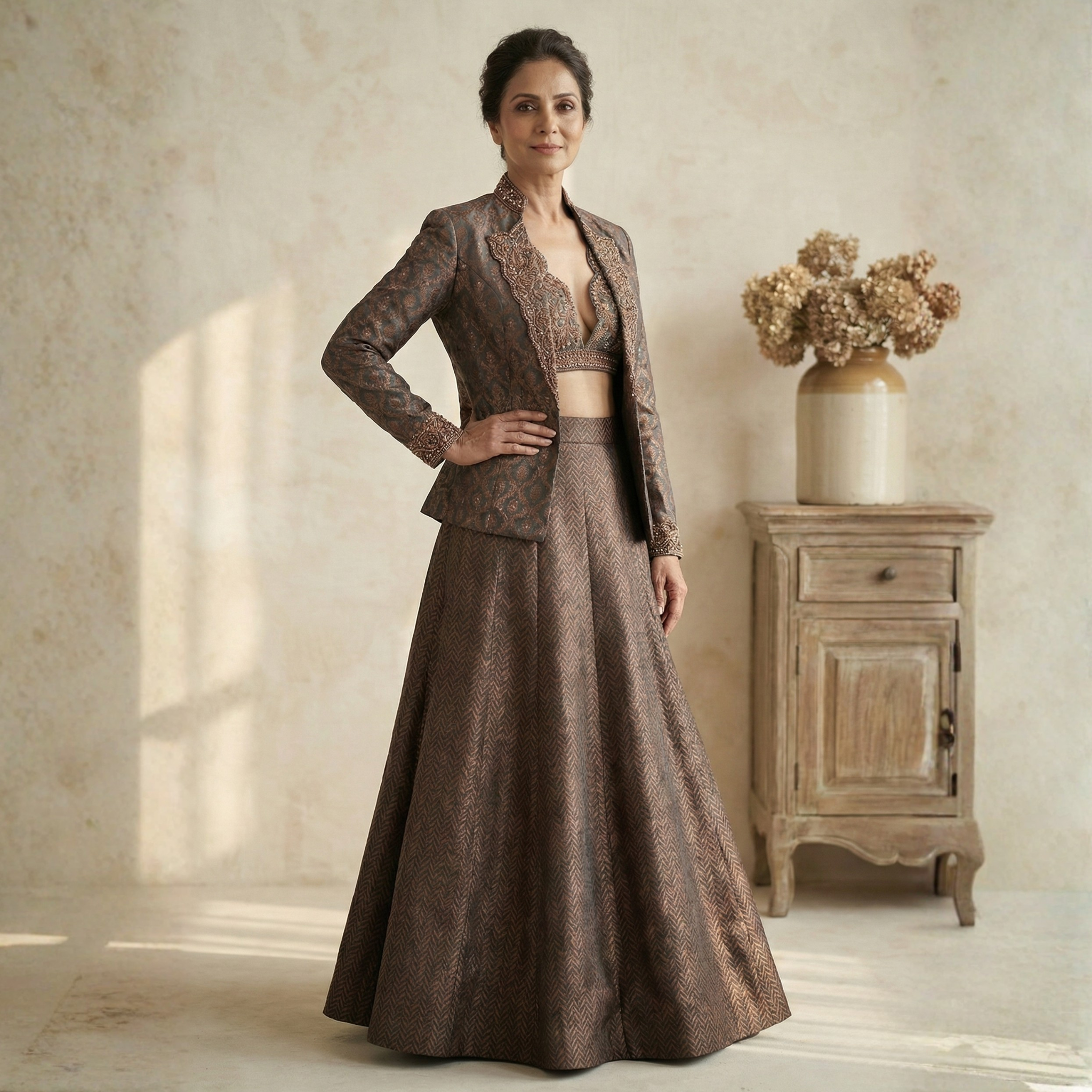 Antique Bronze Brocade Fusion Set with Tailored Jacket