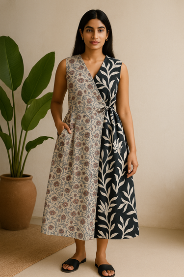 This Black and White Leaf Asymmetrical Print dress features an A-line silhouette that flatters various body types. Crafted from breathable cotton, it offers comfort and durability. The V-neckline with an open collar and nan lapel adds a sophisticated touch, while the sleeveless design ensures ease of movement. Falling below the knee without slits, this dress combines elegance with modesty, making it suitable for both casual and semi-formal occasions.