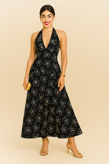 Elevate your wardrobe with this sophisticated Black & White Floral Print Flared Dress. Featuring a flattering V-neck with collar lapel detail and a graceful below-the-knee flared silhouette. Crafted from a premium Polyester-Viscose blend that ensures comfort while maintaining structure. The timeless black and white floral pattern offers versatility for both professional settings and special occasions.