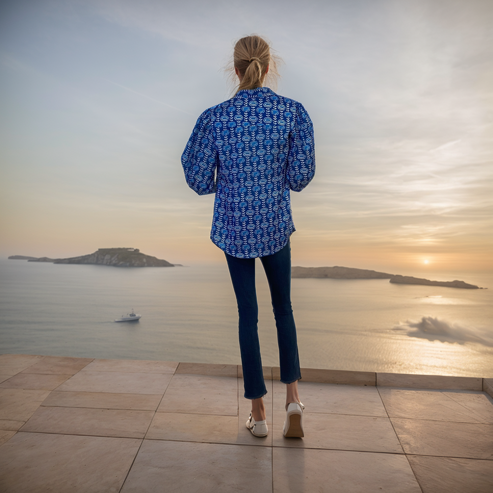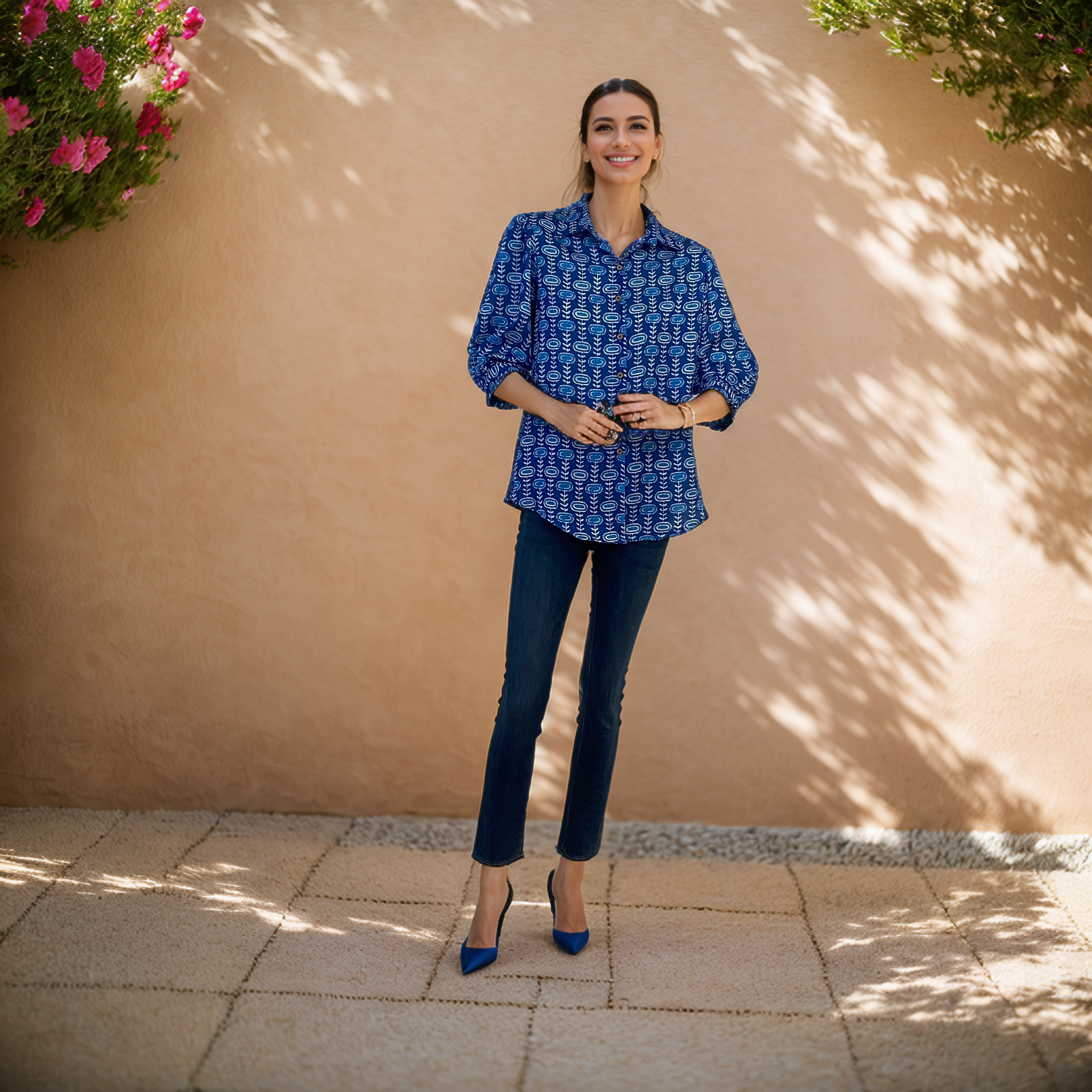 Elevate your wardrobe with our Blue Oval Printed Shirt Collar Peasant Sleeves Modal Satin Tunic! Featuring a unique oval print and a stylish shirt collar, this tunic will add a touch of sophistication to any outfit. The peasant sleeves and modal satin fabric provide ultimate comfort, making it the perfect blend of fashion and functionality. Add it to your collection today and experience effortless style!