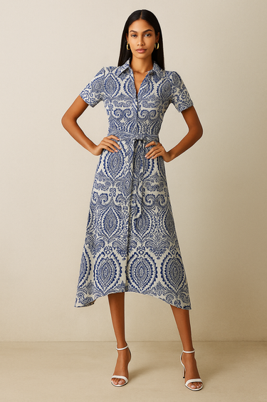 Blue & White Abstract Print Shirt Dress with the following garment features shirt style v-neck neckline shirt collar lapel regular sleeve type below-the-knee top length type slits and made with the following Cotton Cambric fabric Blue & White Abstract Print fabric details.