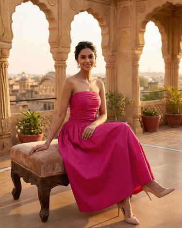 This stunning piece is designed for the woman who loves a classic, feminine silhouette with a modern touch. The dress features a fitted, strapless bandeau bodice adorned with delicate ruching and pleating, creating a beautifully structured look. The cinched waist flows into a voluminous, flared midi skirt that offers graceful movement and a flattering fit for all body types.