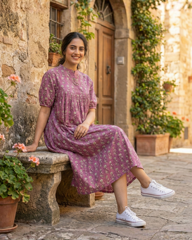 This designed is designed for the free spirit. Bathed in a soft, dusty pink hue, it features a dainty all-over floral block print that whispers of vintage gardens and sunny afternoons. The silhouette is the star here—featuring a high empire waist with generous gathers that cascade down into a breezy, voluminous skirt, allowing for maximum twirl and movement.