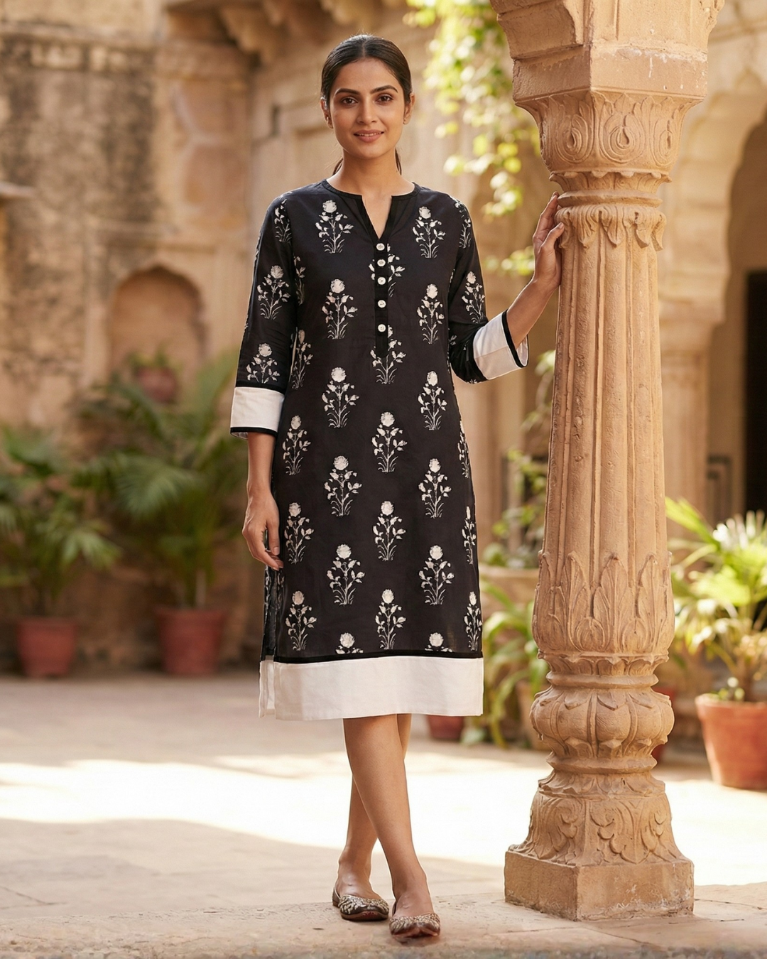 This garment proves that black and white is a combination that never goes out of style. Set against a deep black base, the dress features distinct, vertical white floral motifs inspired by traditional block printing, creating a look that is both rooted in heritage and visually striking.