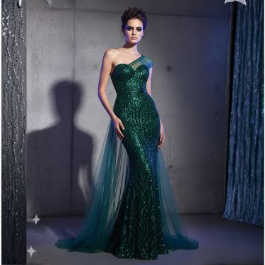 Captivate in this striking emerald sequin mermaid gown, designed with a dramatic one-shoulder silhouette that commands attention. The shimmering sequin embellishment catches light beautifully, creating an enchanting shimmer with every movement. The fitted mermaid cut flatters the silhouette while the flowing train adds timeless elegance—perfect for weddings, galas, and high-impact evening occasions. Crafted for those who embrace bold, sophisticated style.