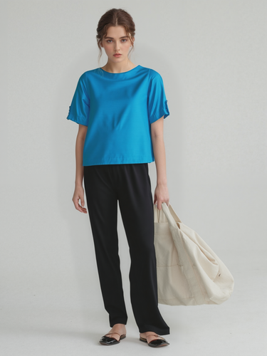 Ferozi Blue Solid Color Fusion Round Neckline Collar Top