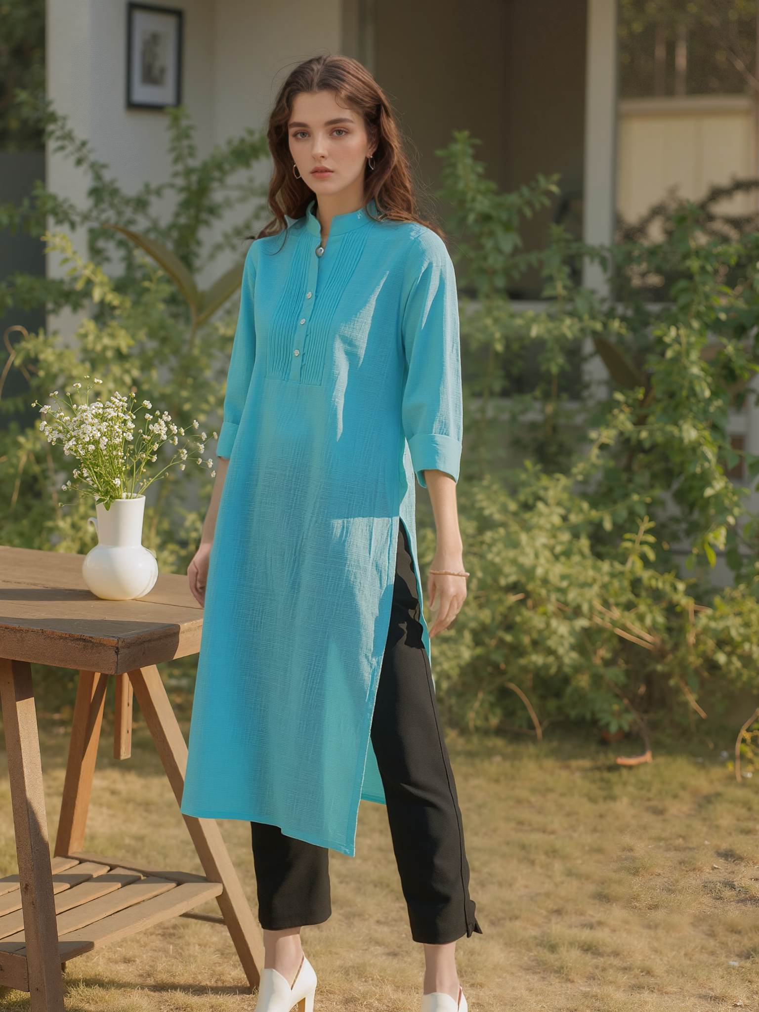 This Ferozi Blue Kurta features a refined V-neckline paired with a Mandarin collar, offering a modern yet traditional silhouette. Crafted from breathable cotton fabric, it ensures comfort throughout the day. The long sleeves and side slits enhance mobility and style, making it an ideal choice for both casual and formal occasions. Its solid color design adds versatility to your wardrobe, combining classic elements with contemporary tailoring.