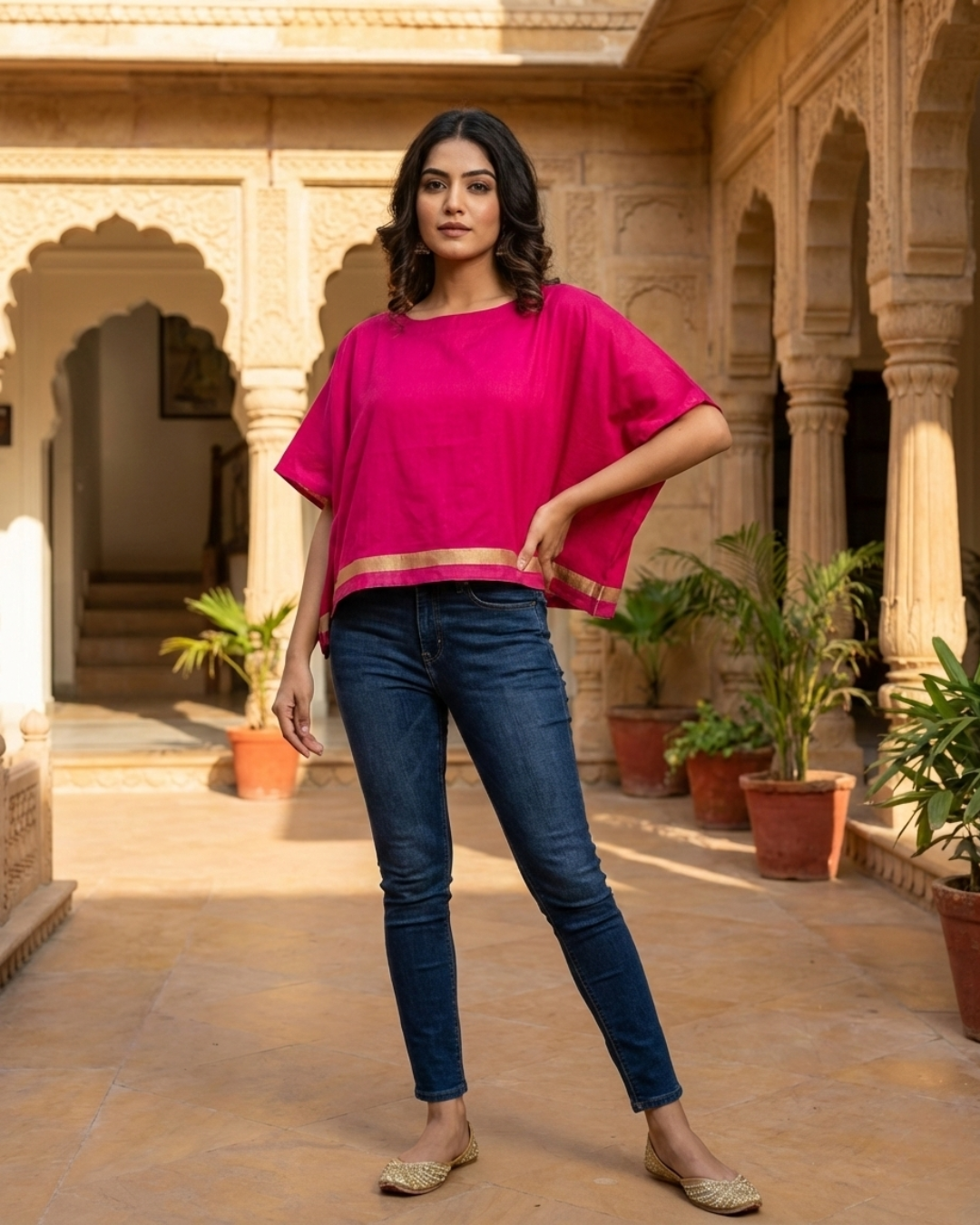 Fuchsia Silk-Blend Boxy Top with Gold Zari Hem