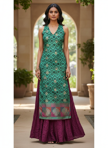 A sleeveless V-neck kurta in rich teal green, featuring an all-over geometric weave with subtle gold accents. Designed in a clean, straight silhouette, it is finished with a contrasting plum border at the hem. Paired with a textured, flared plum skirt, this ensemble blends modern elegance with timeless Indian craftsmanship—perfect for festive and formal occasions.