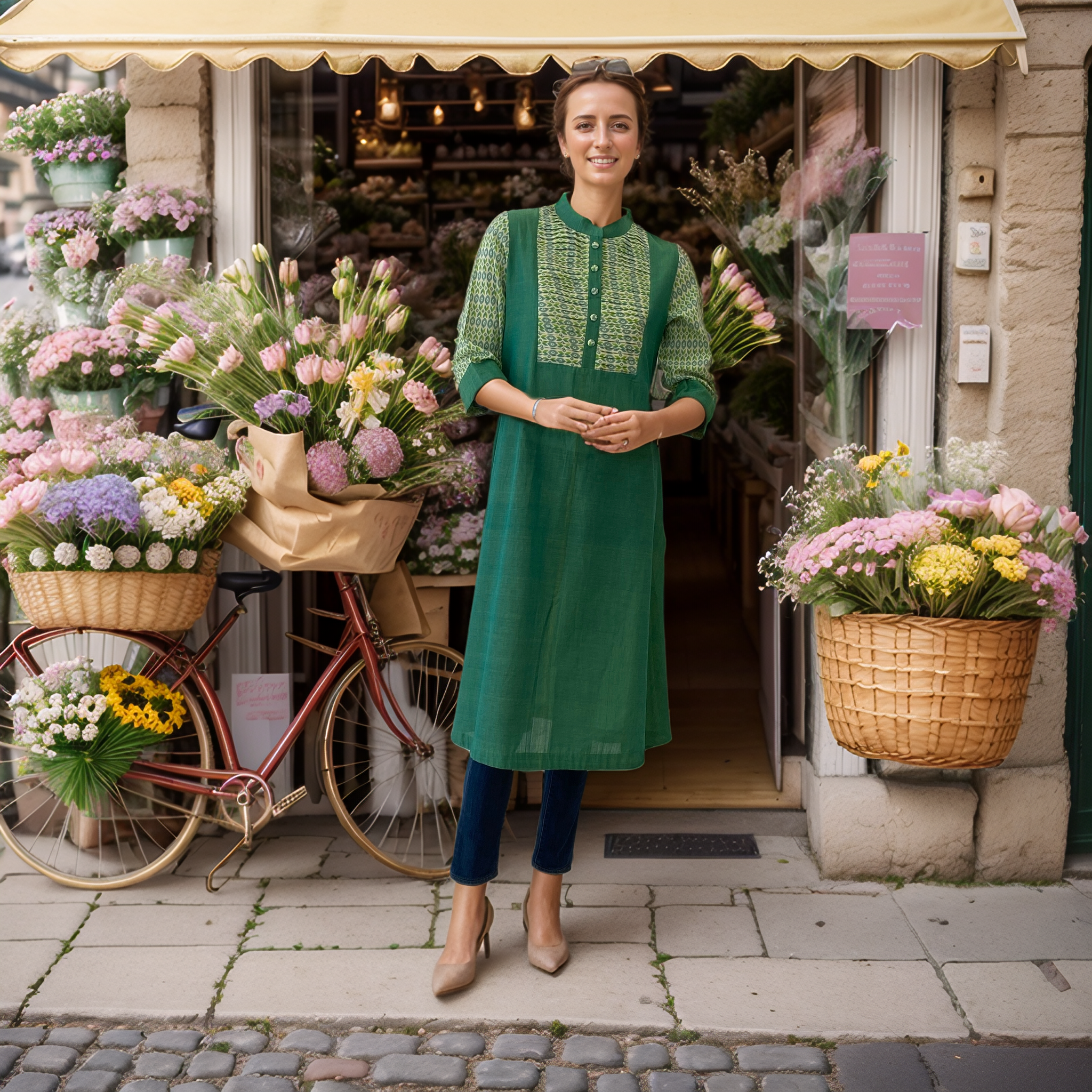 Green With Printed Yoke And Sleeves Kurta