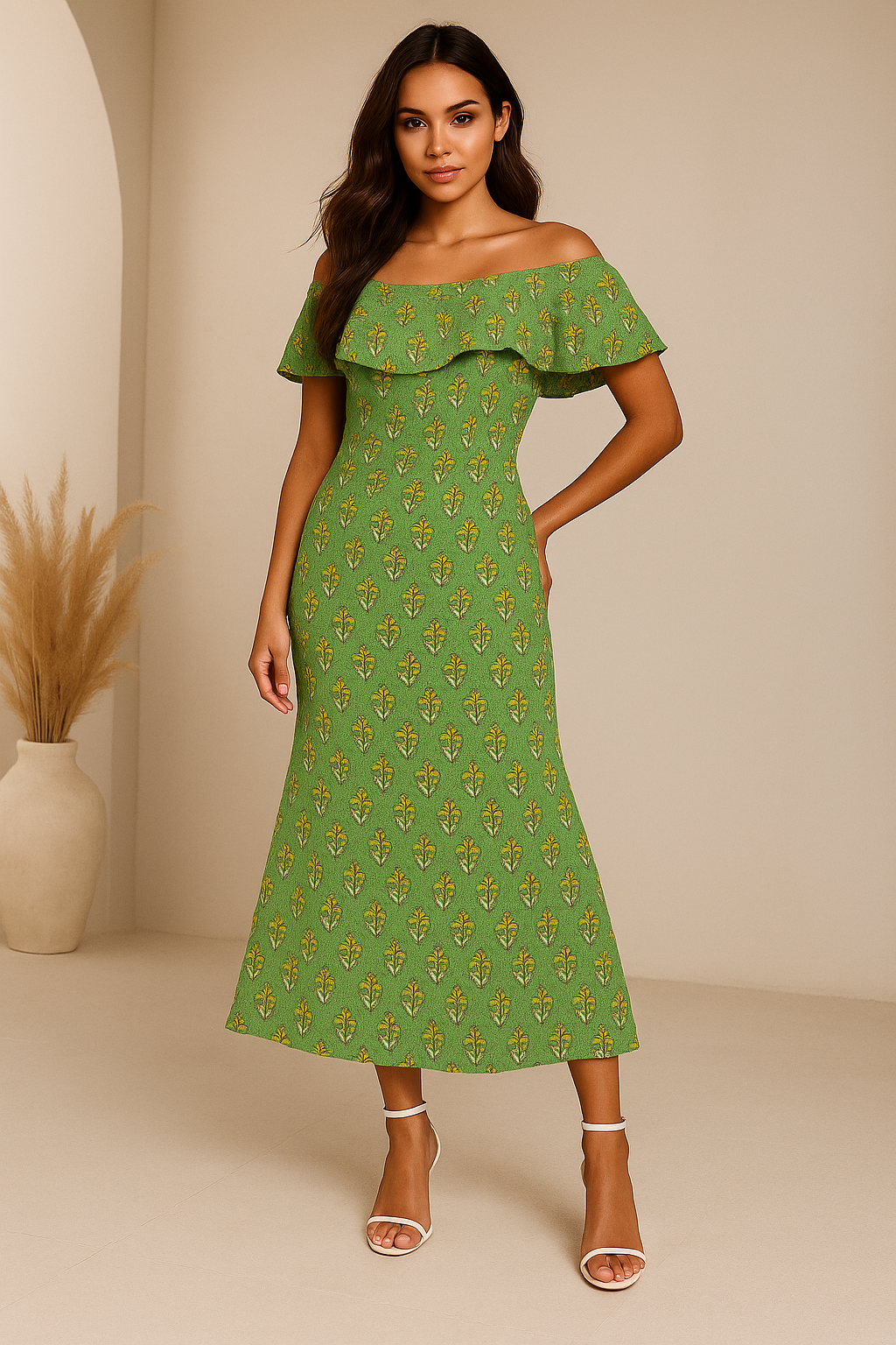 Elevate your wardrobe with this sophisticated Green Sangeneri Dress featuring delicate Yellow Butti Print on premium Cotton Cambric fabric. The silhouette accentuates your curves while the off-shoulder neckline with collar lapel adds a touch of elegance. The below-the-knee length with strategic slits ensures both style and comfort for any occasion. This expertly crafted piece combines traditional Sangeneri printing techniques with contemporary design elements.
