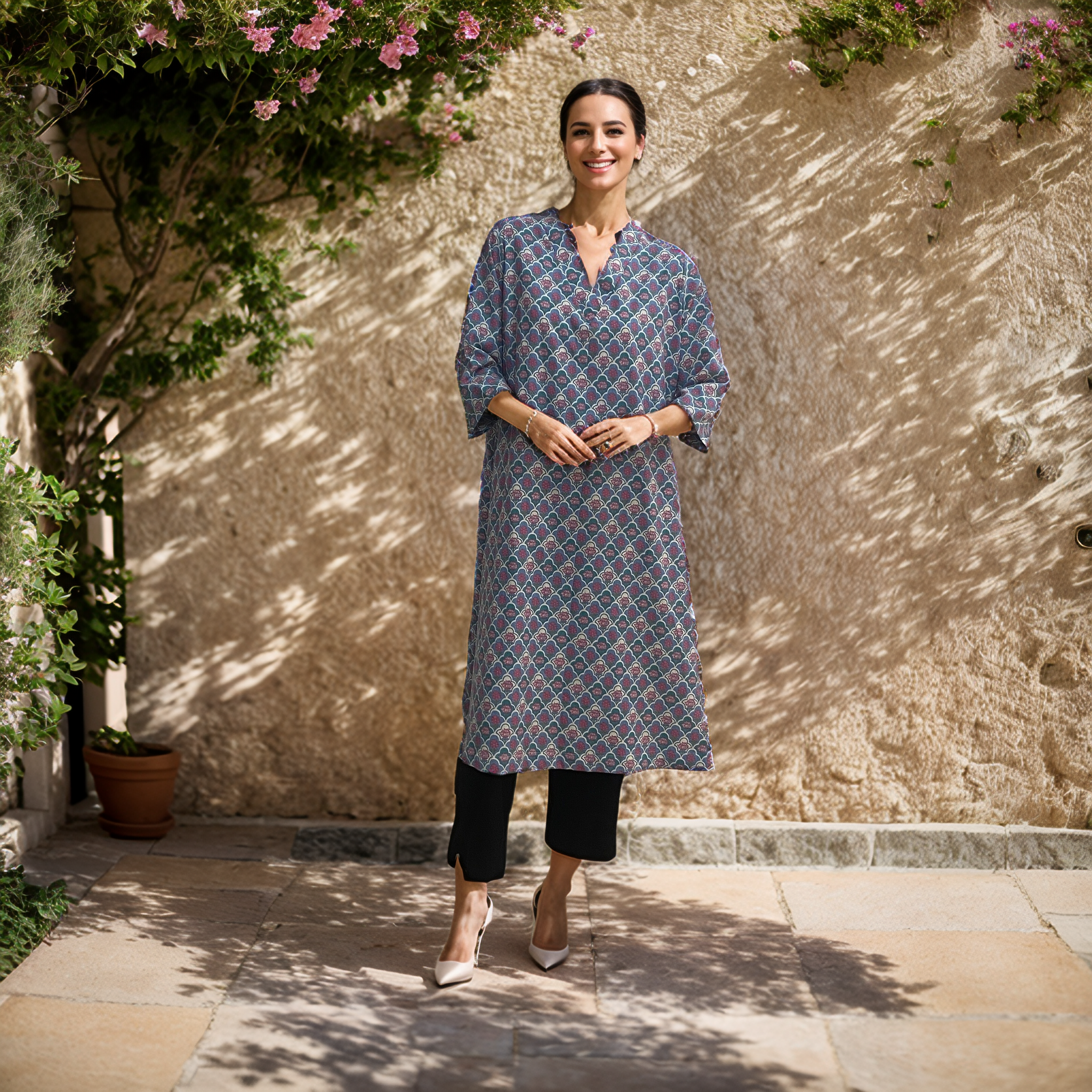 Elevate your style with our Grey Lotus Printed Overlap V neck Cotton Kurta! Crafted with soft, breathable cotton, this kurta features a unique overlapped v-neck design and a stunning lotus print. Perfect for adding a touch of elegance and comfort to your wardrobe. Embrace the beauty of tradition with our Grey Lotus Kurta!