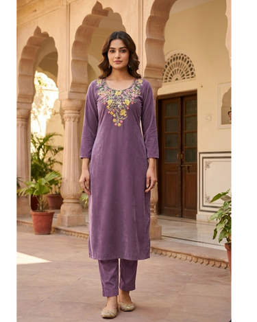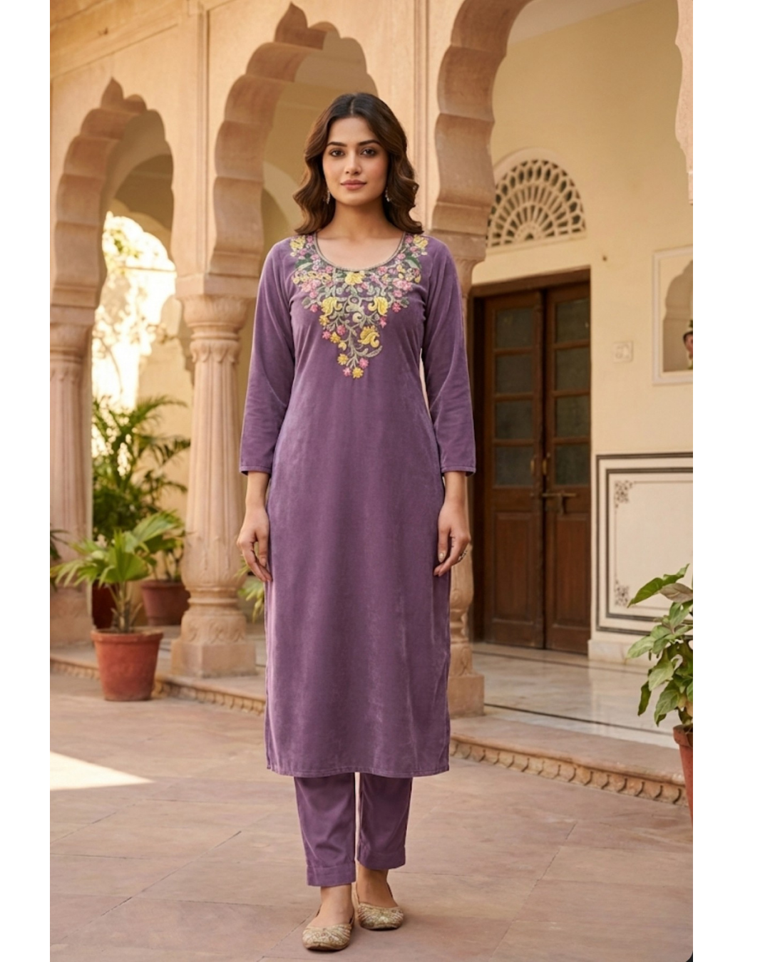 Mauve Velvet Straight Kurta Set with Floral Neck Embroidery