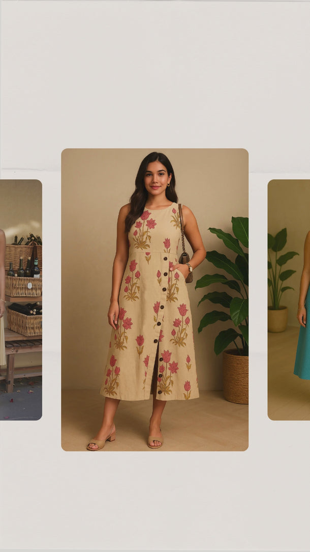 This elegant dress features an A-line silhouette crafted from breathable Cotton Cambric fabric, showcasing an off-white base adorned with delicate peach daffodils in a traditional Sanganeri Butta print. Designed with a round neckline and collar, sleeveless cut, and a modest below-the-knee length, it offers a refined and comfortable fit ideal for both casual and semi-formal occasions. The absence of slits ensures a graceful drape, making it a versatile addition to your wardrobe.