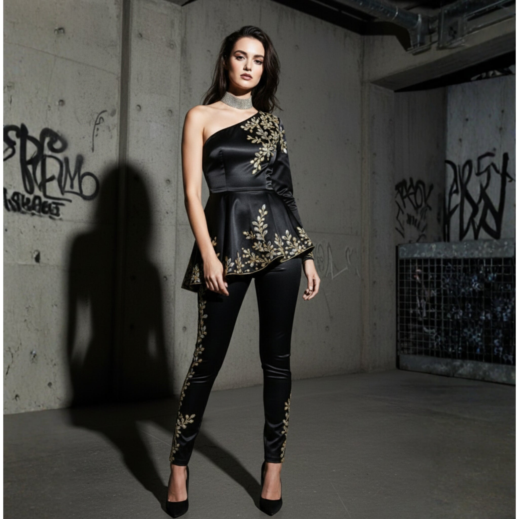 Elevate your evening wardrobe with this striking one-shoulder peplum ensemble. The asymmetrical neckline creates a sophisticated silhouette, while the structured peplum detail adds contemporary flair and dimension. Rich black fabric paired with luxe gold accents delivers understated opulence—perfect for cocktail events, celebrations, or upscale occasions. The tailored fit ensures a polished, editorial-ready appearance that commands attention without excess. Versatile enough to transition from dinner to after-party with confidence.