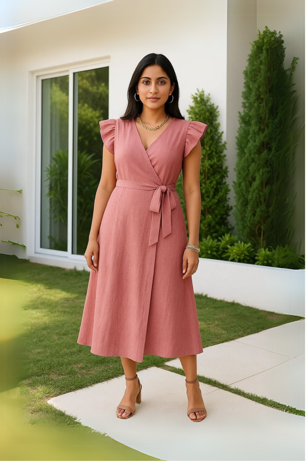 Elevate your wardrobe with this sophisticated Pink Solid Color Dress. Featuring a flattering V-neck with lapel collar detailing and below-the-knee length with stylish slits for ease of movement. Crafted from premium cotton fabric, this solid pink dress offers breathable comfort while maintaining a polished silhouette suitable for both professional settings and elegant occasions.