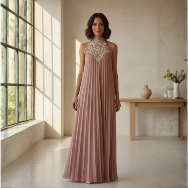 Pleated Chiffon Halterneck Maxi Dress with Embroidered Yoke